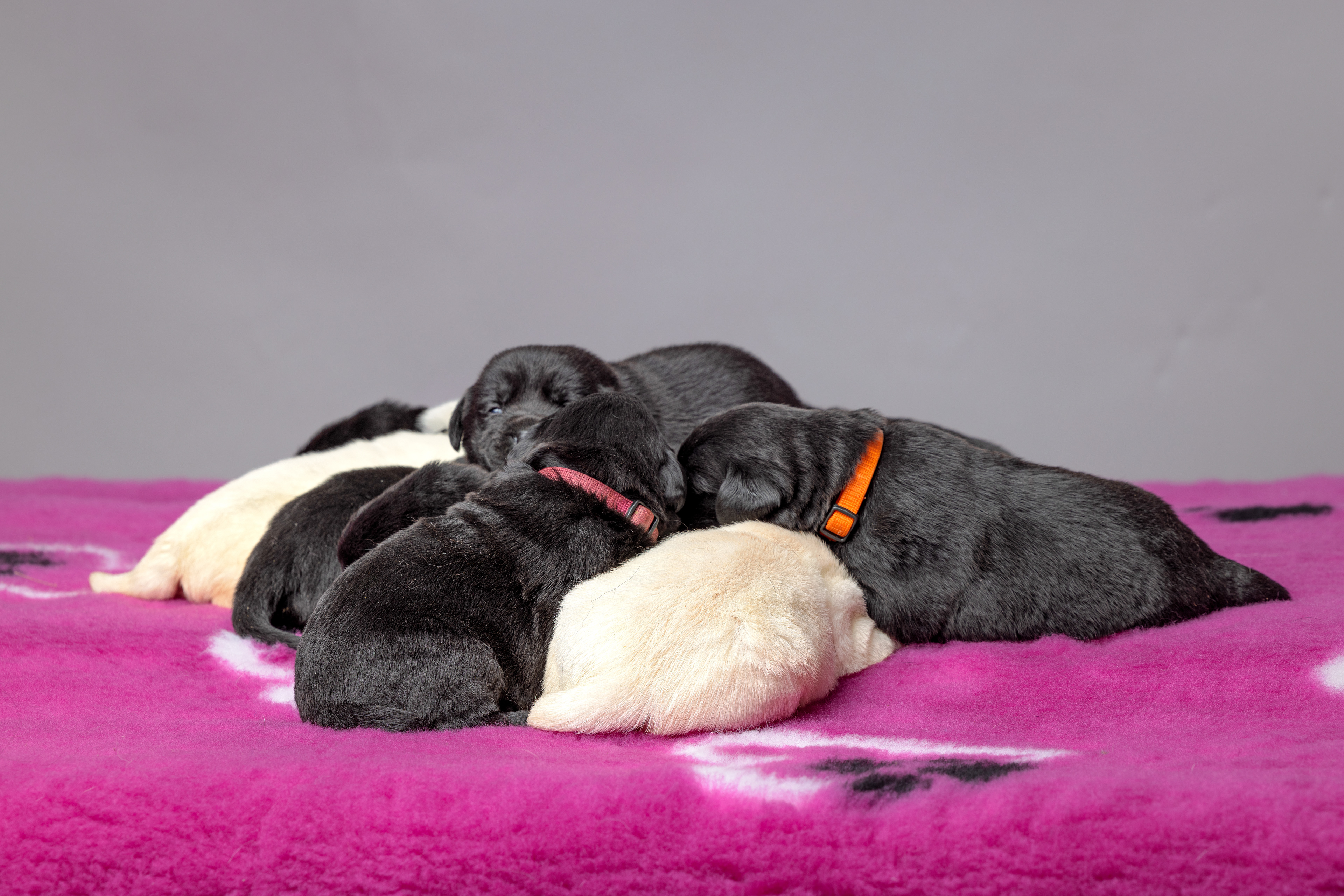 De twee gele reutjes, in een diepe slaap. Bovenop het kleinere grijze bandje. De pups met het zwarte bandje was bij de geboorte al zwaarder en is samen met reutje blauw en teefje rood het voorbeeld van Hollands welvaart!