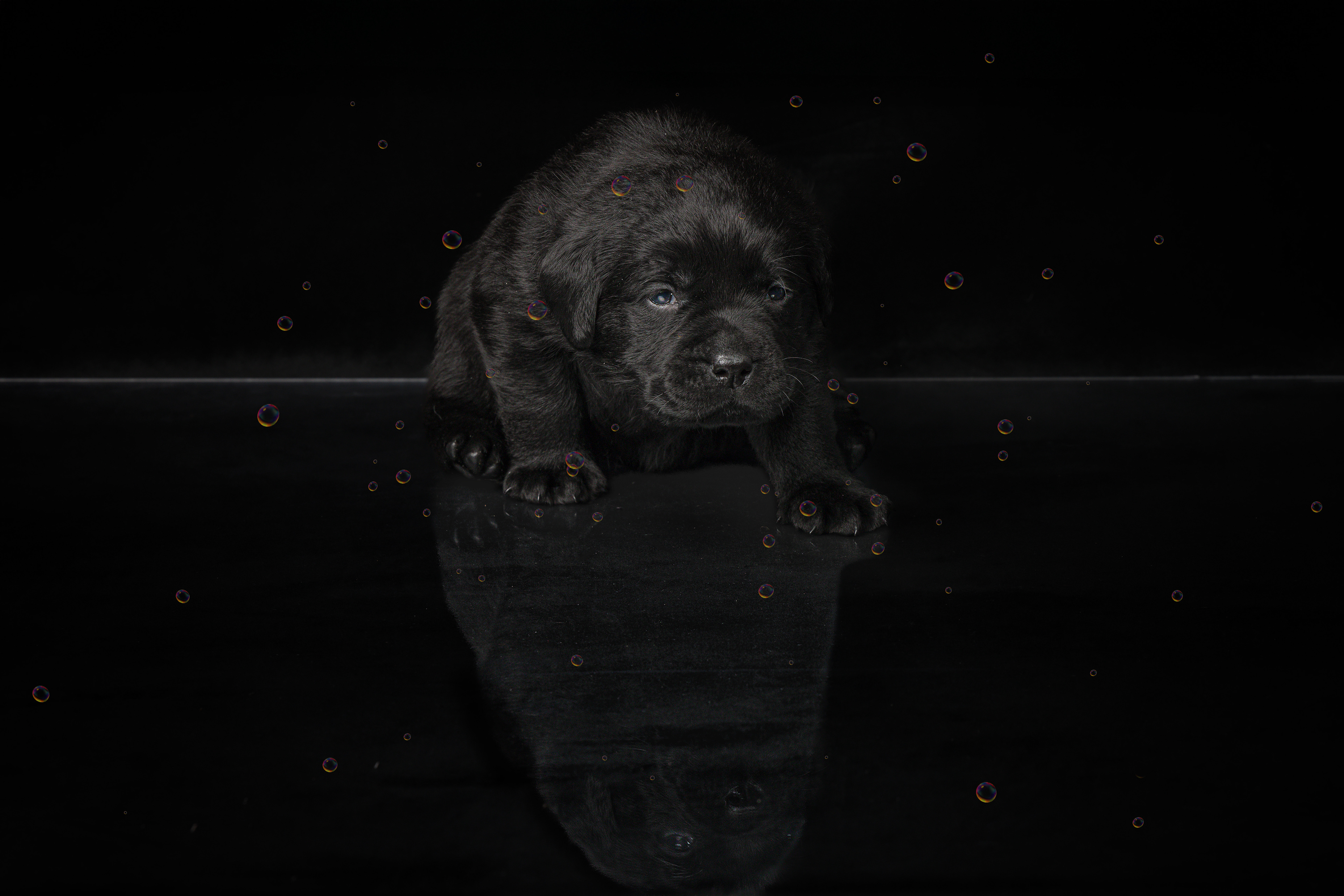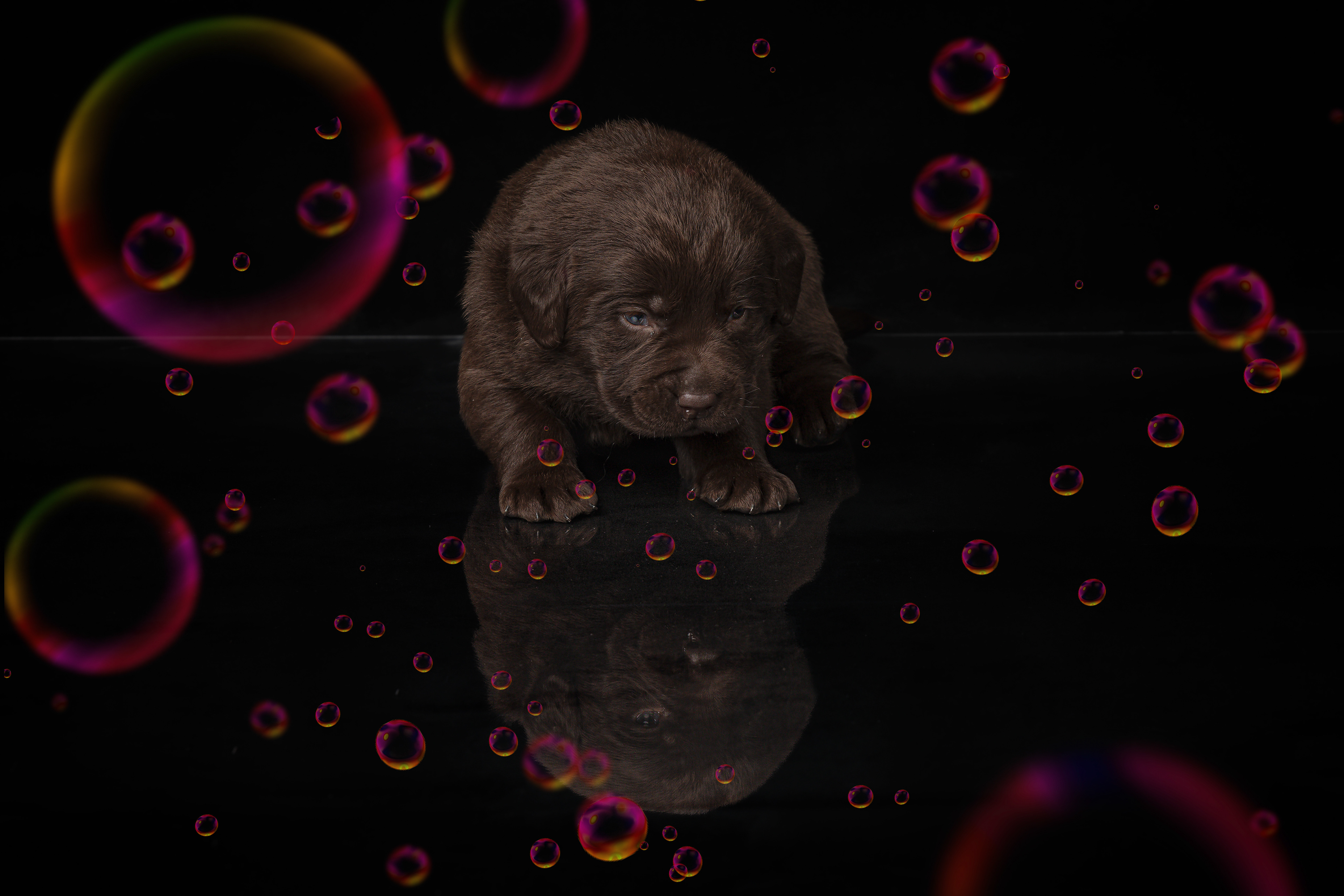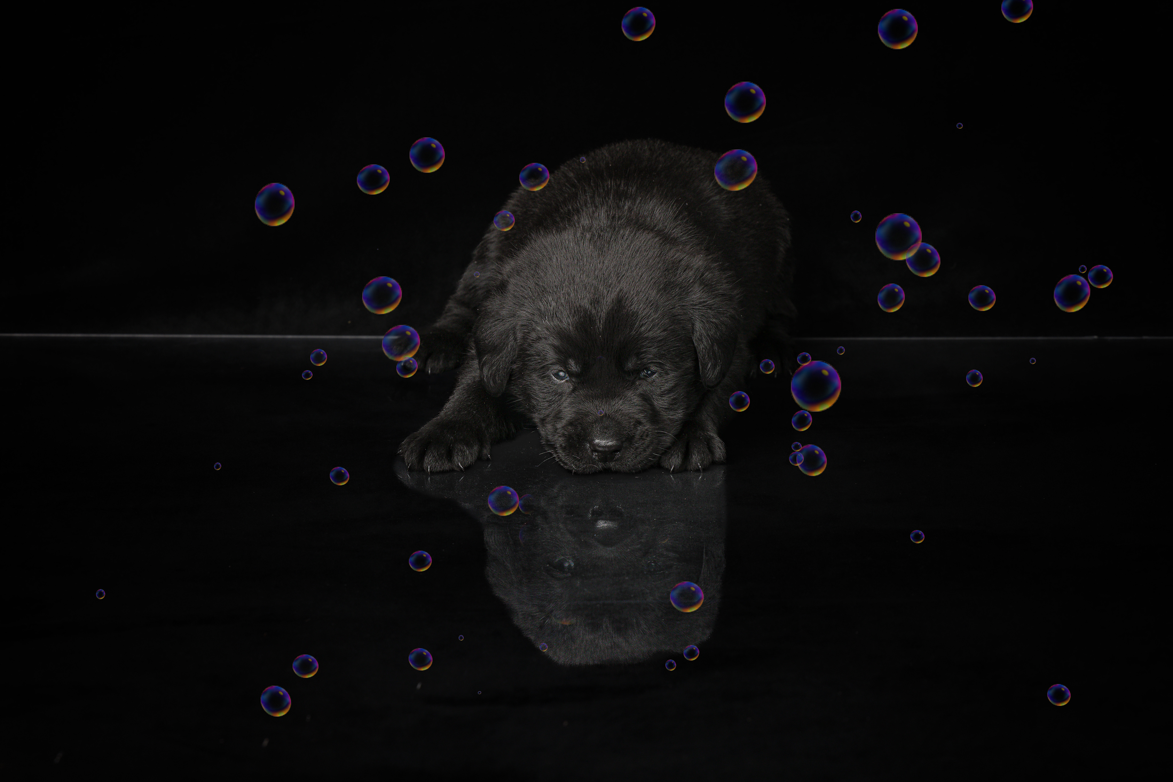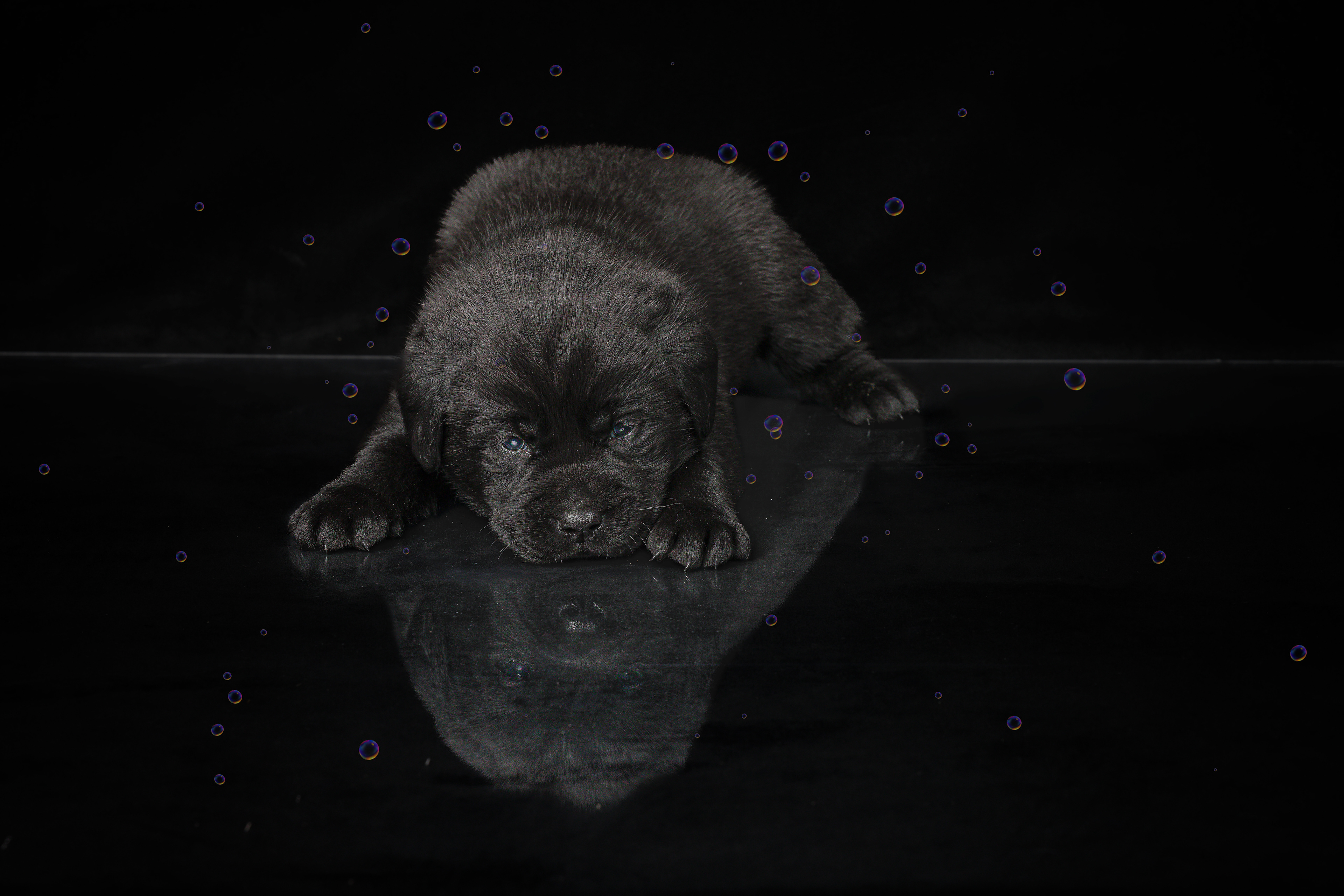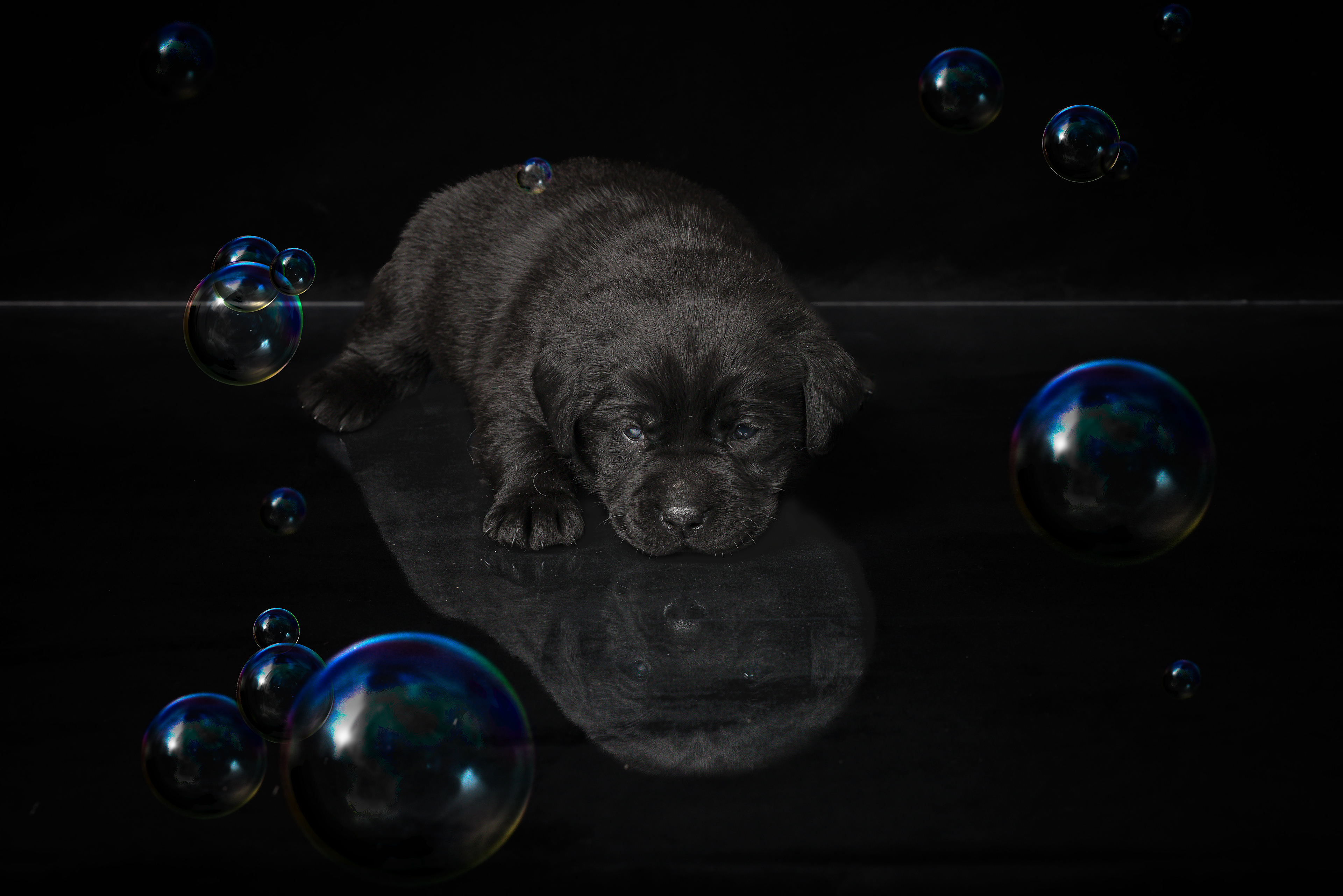 Vandaag de laatste dag van ons logeetje. Ik had bedacht om foto's van alle pups afzonderlijk te maken op een zwarte achtergrond en te werken met een perspex plaat voor reflectie. Omdat ik geen bellenblaas kon vinden, heb ik de bellen in Photoshop toegevoegd. Natuurlijk moest er ook een foto van haar hulphond gemaakt worden en dat was voor mij even een mooie gelegenheid om de instellingen goed te krijgen.