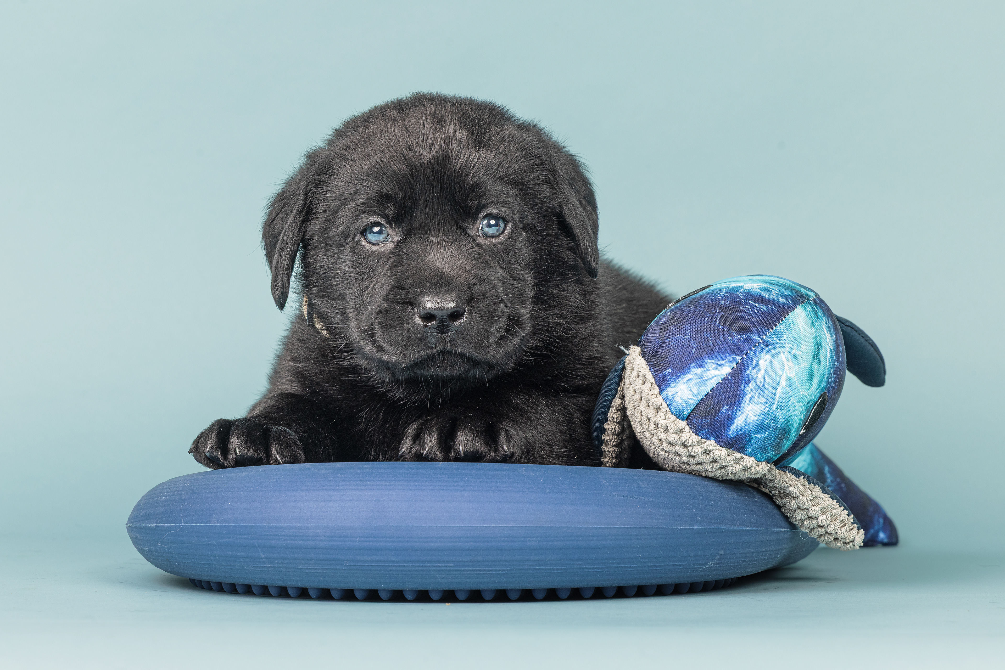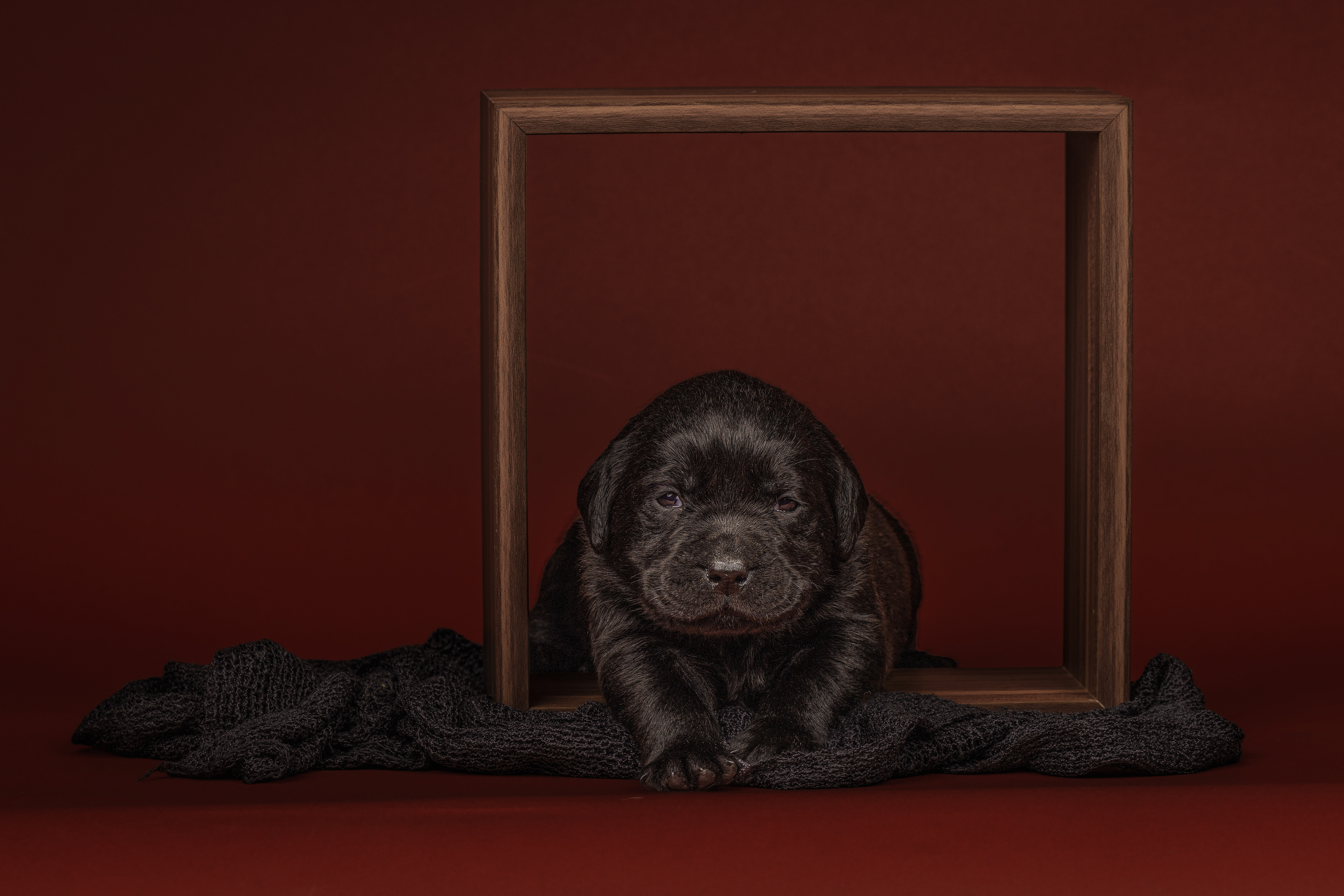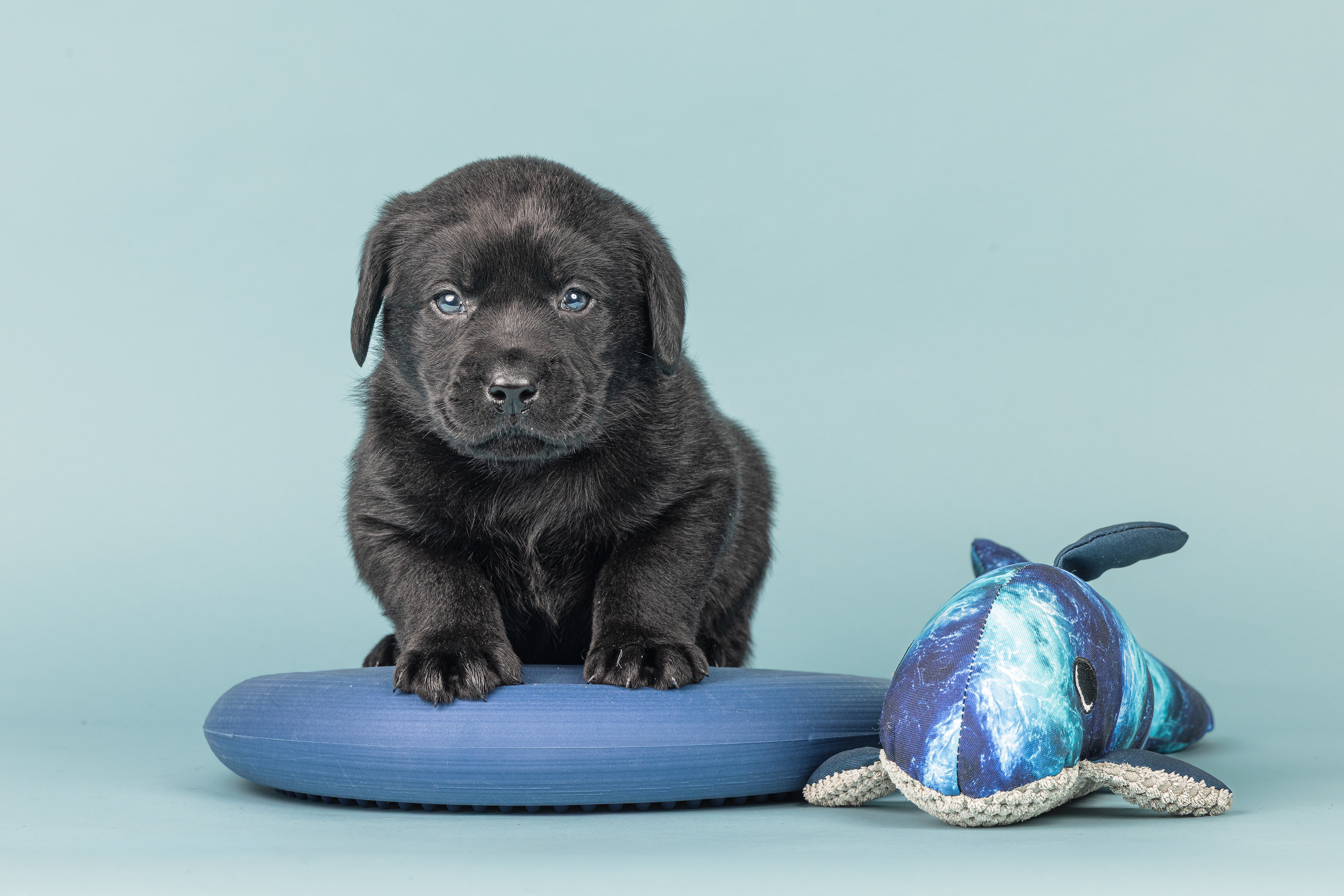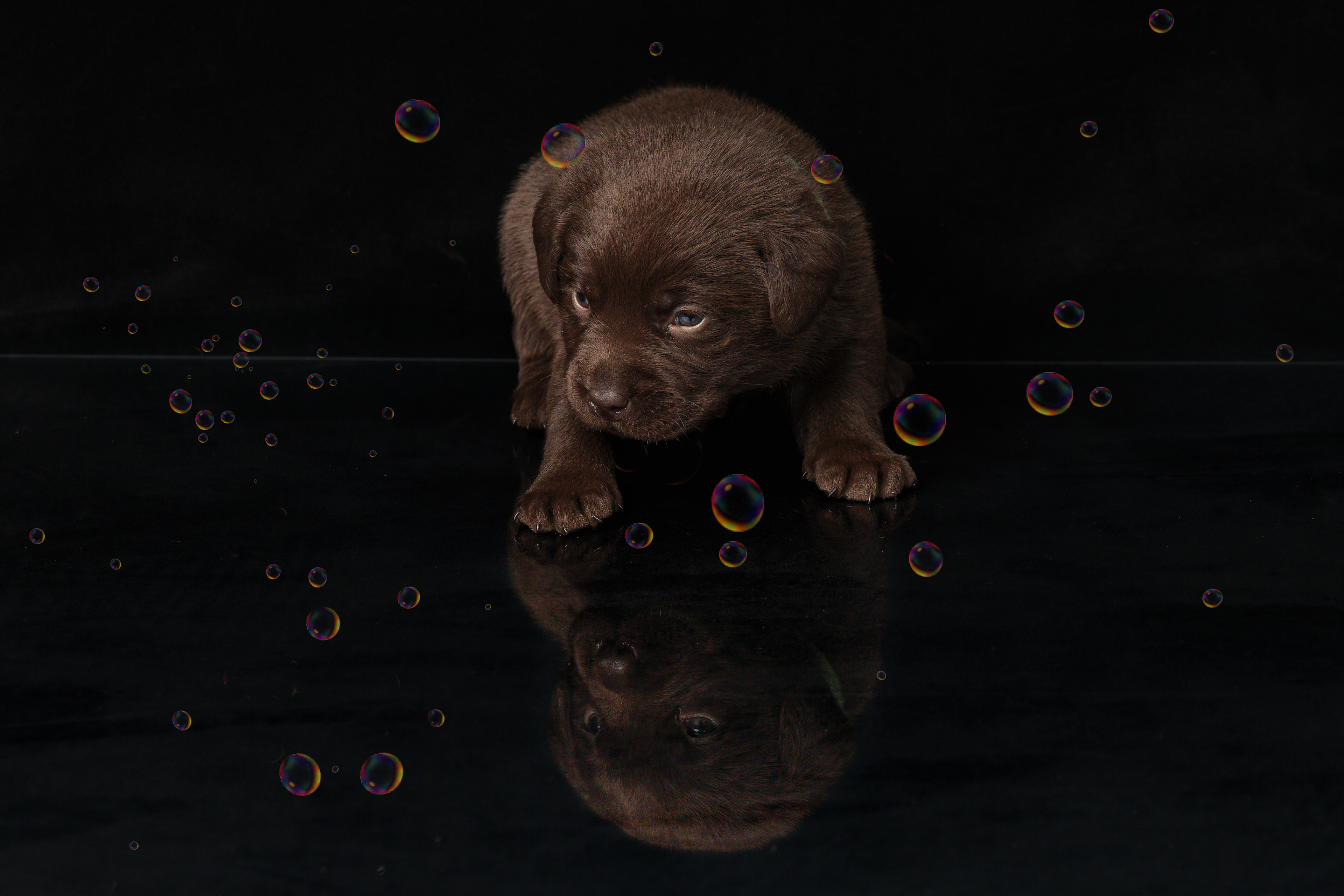 Vandaag de laatste dag van ons logeetje. Ik had bedacht om foto's van alle pups afzonderlijk te maken op een zwarte achtergrond en te werken met een perspex plaat voor reflectie. Omdat ik geen bellenblaas kon vinden, heb ik de bellen in Photoshop toegevoegd. Natuurlijk moest er ook een foto van haar hulphond gemaakt worden en dat was voor mij even een mooie gelegenheid om de instellingen goed te krijgen.