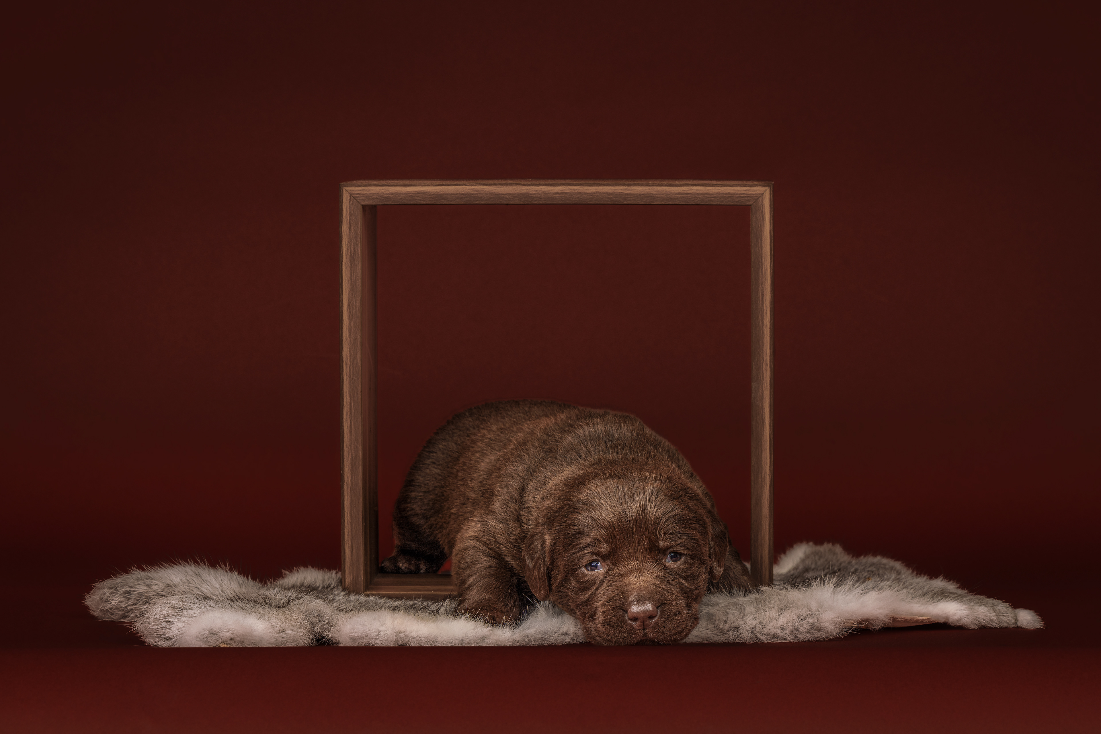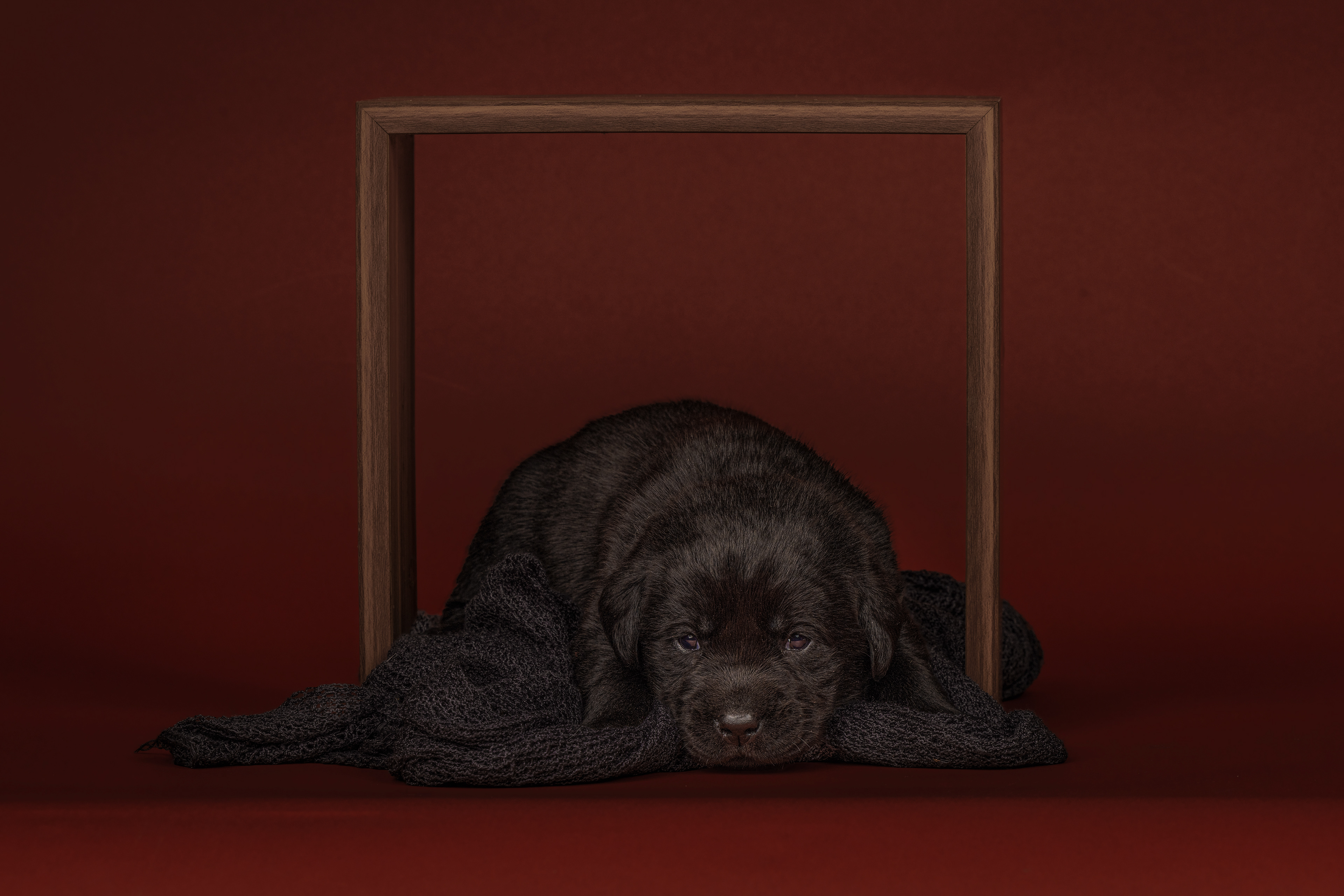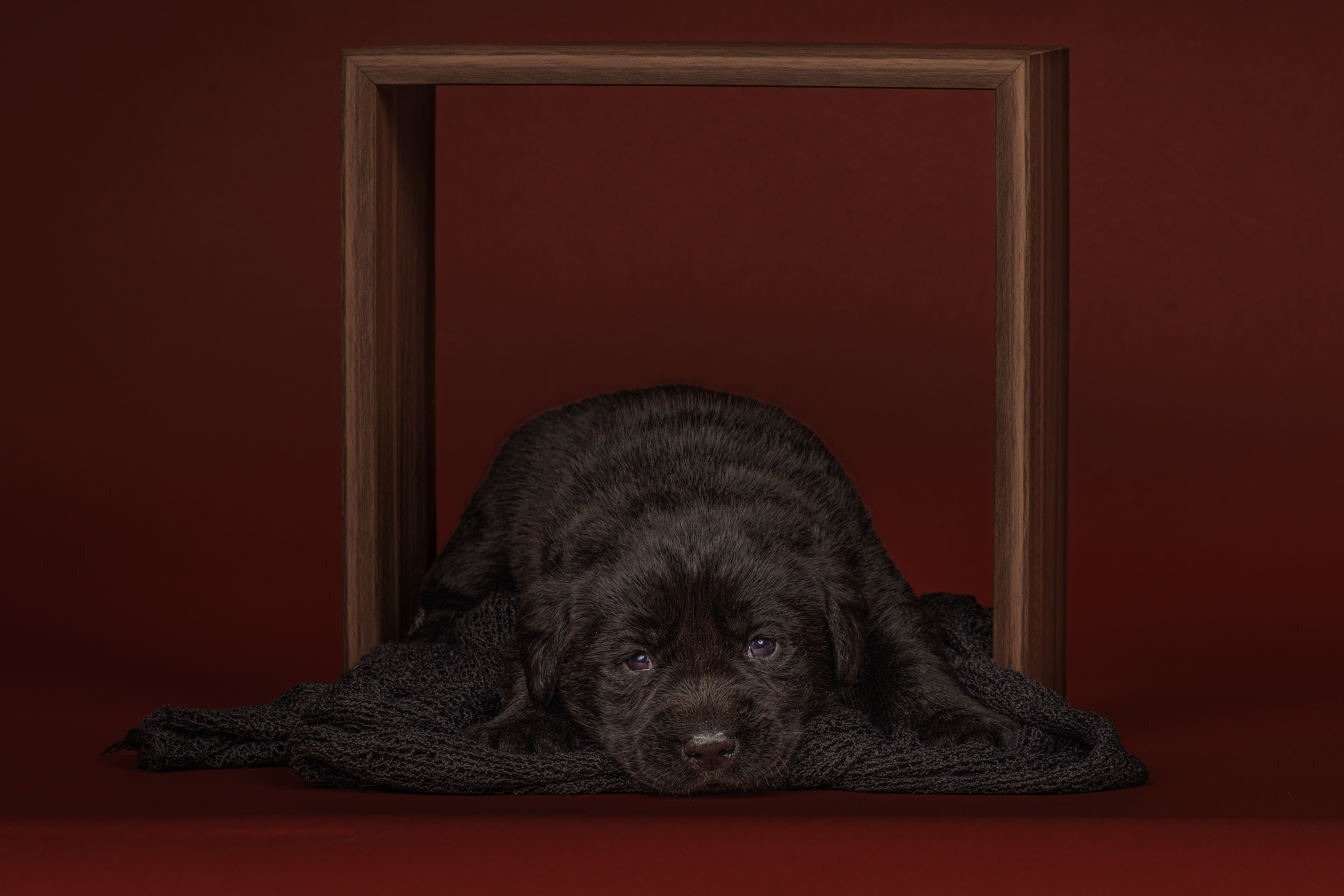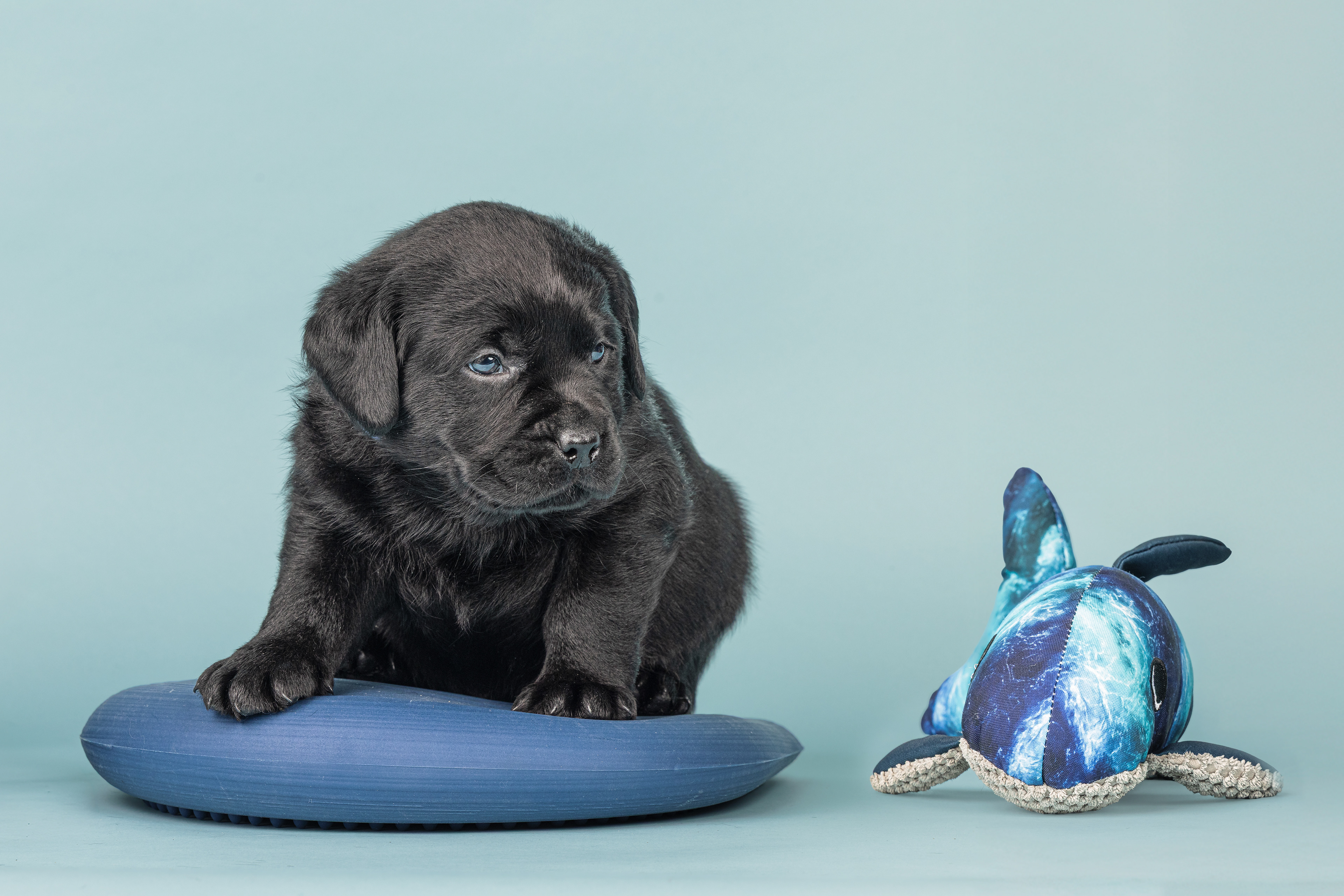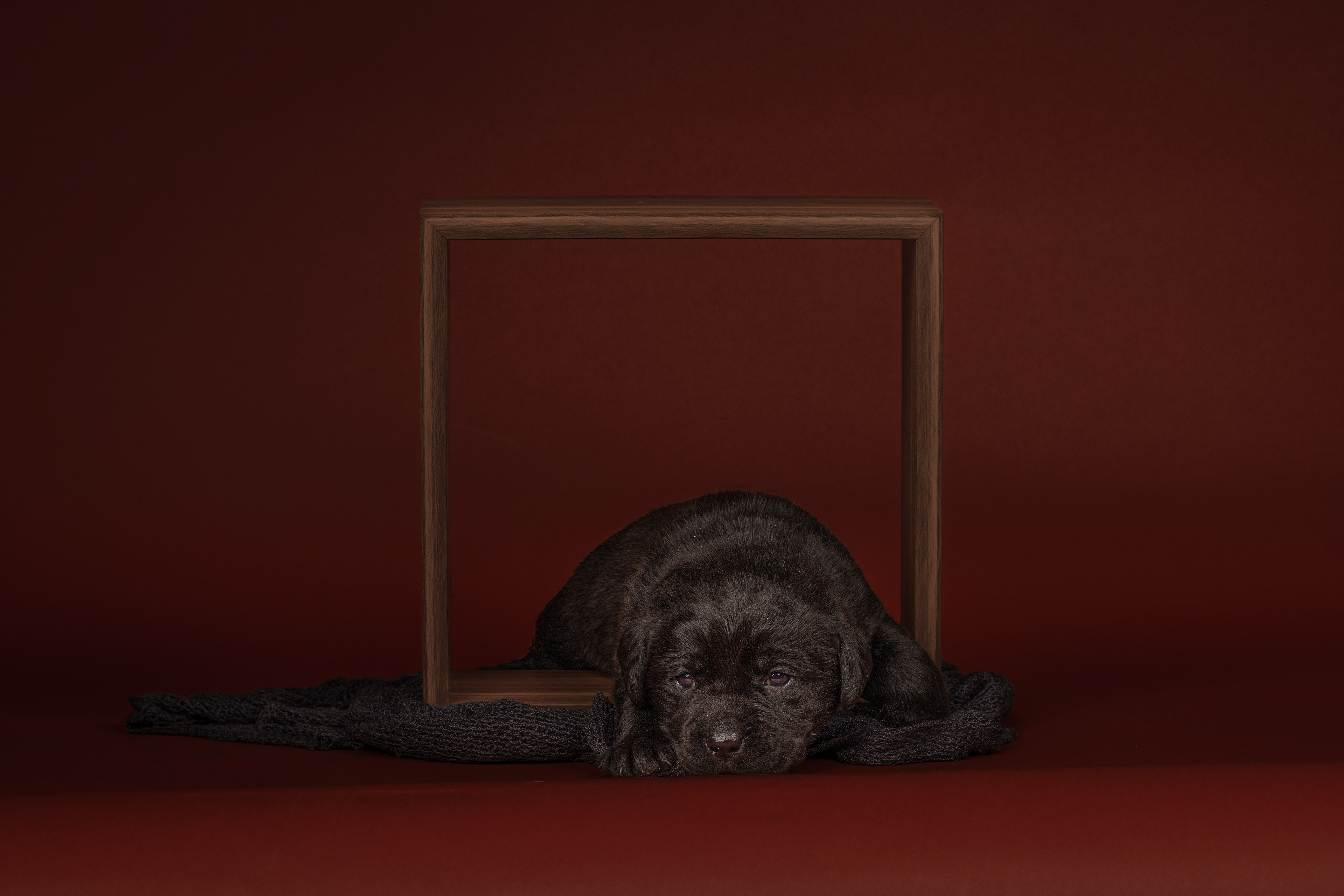 Vandaag de laatste dag van ons logeetje. Ik had bedacht om foto's van alle pups afzonderlijk te maken op een zwarte achtergrond en te werken met een perspex plaat voor reflectie. Omdat ik geen bellenblaas kon vinden, heb ik de bellen in Photoshop toegevoegd. Natuurlijk moest er ook een foto van haar hulphond gemaakt worden en dat was voor mij even een mooie gelegenheid om de instellingen goed te krijgen.