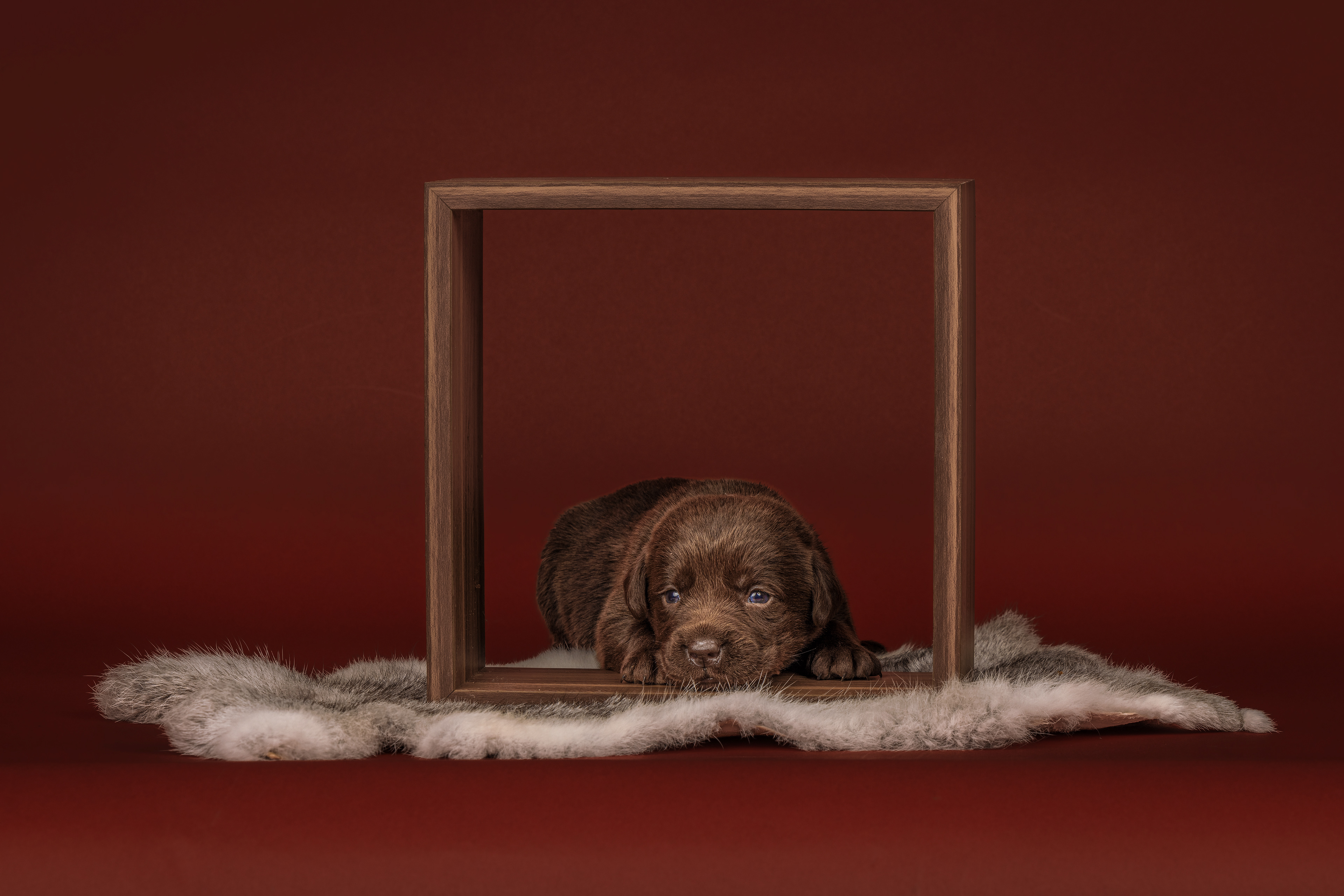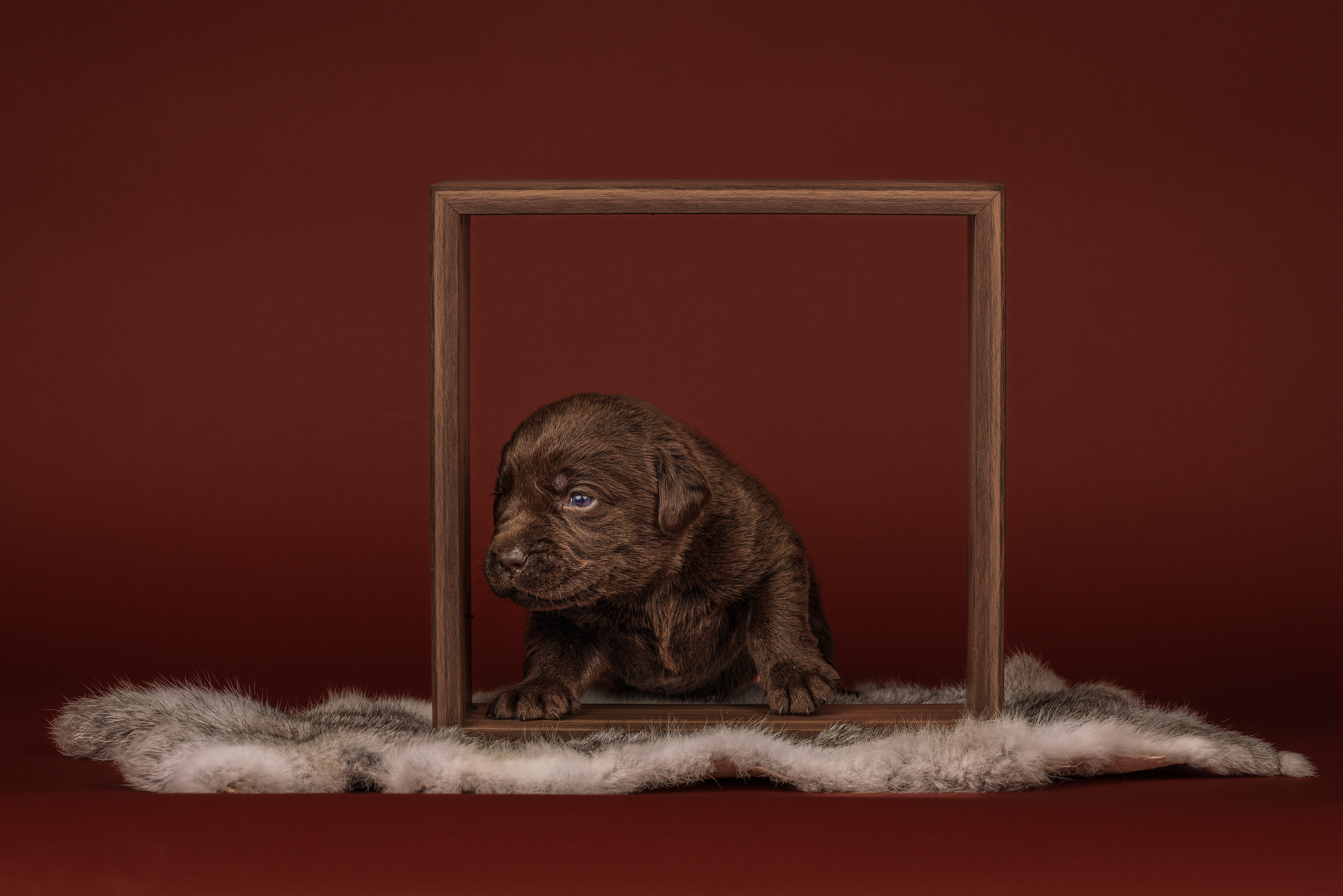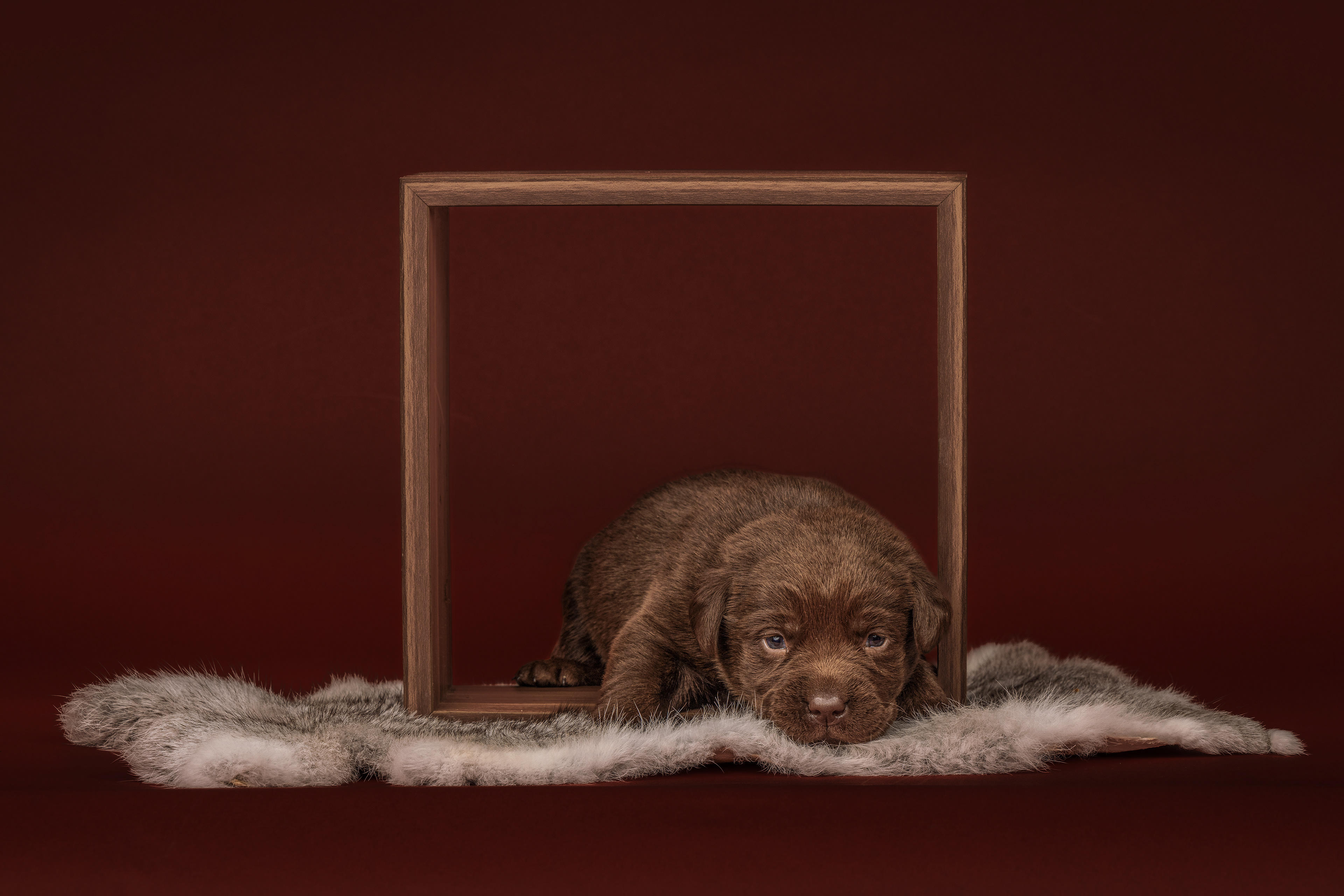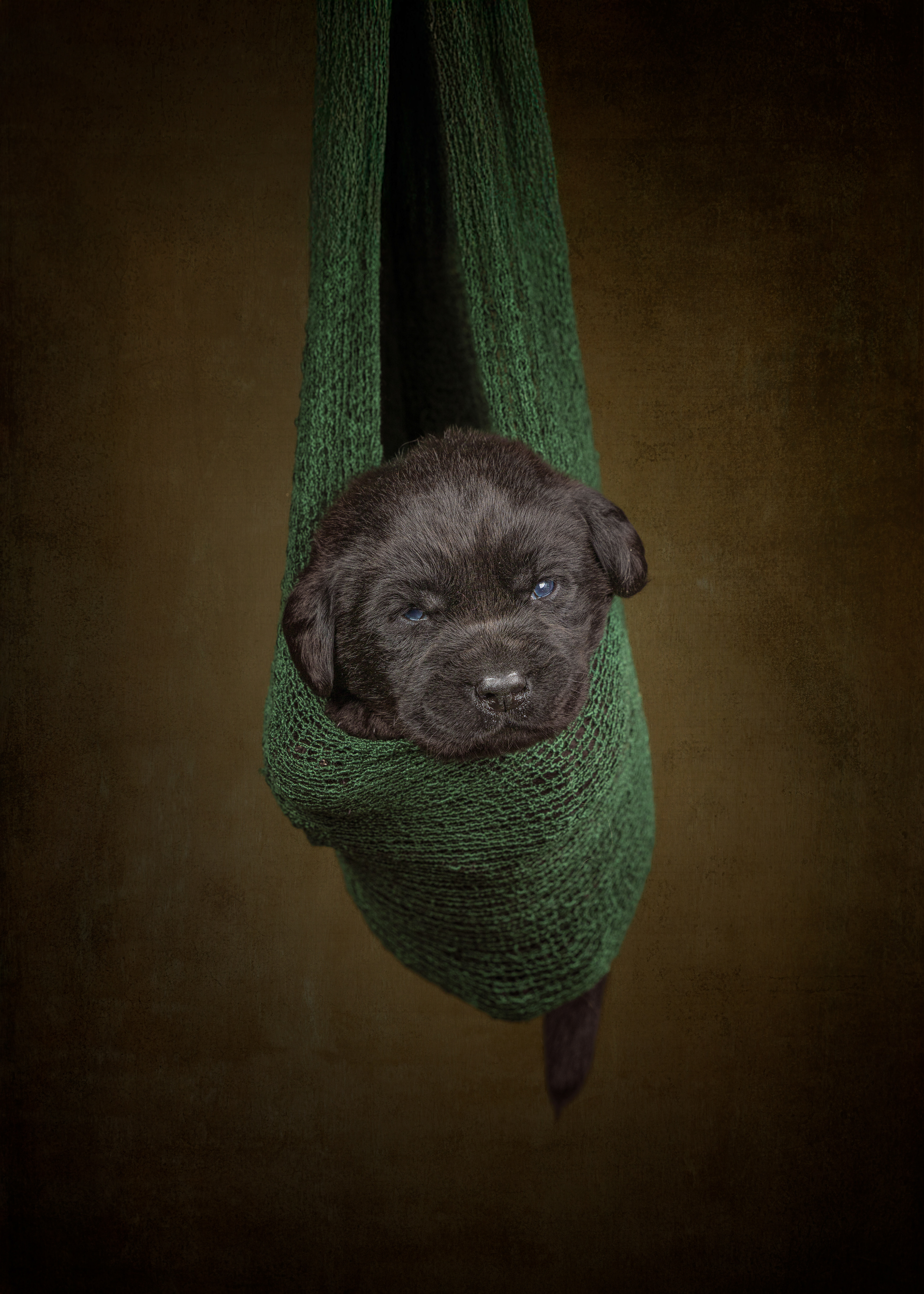 Vandaag de laatste dag van ons logeetje. Ik had bedacht om foto's van alle pups afzonderlijk te maken op een zwarte achtergrond en te werken met een perspex plaat voor reflectie. Omdat ik geen bellenblaas kon vinden, heb ik de bellen in Photoshop toegevoegd. Natuurlijk moest er ook een foto van haar hulphond gemaakt worden en dat was voor mij even een mooie gelegenheid om de instellingen goed te krijgen.