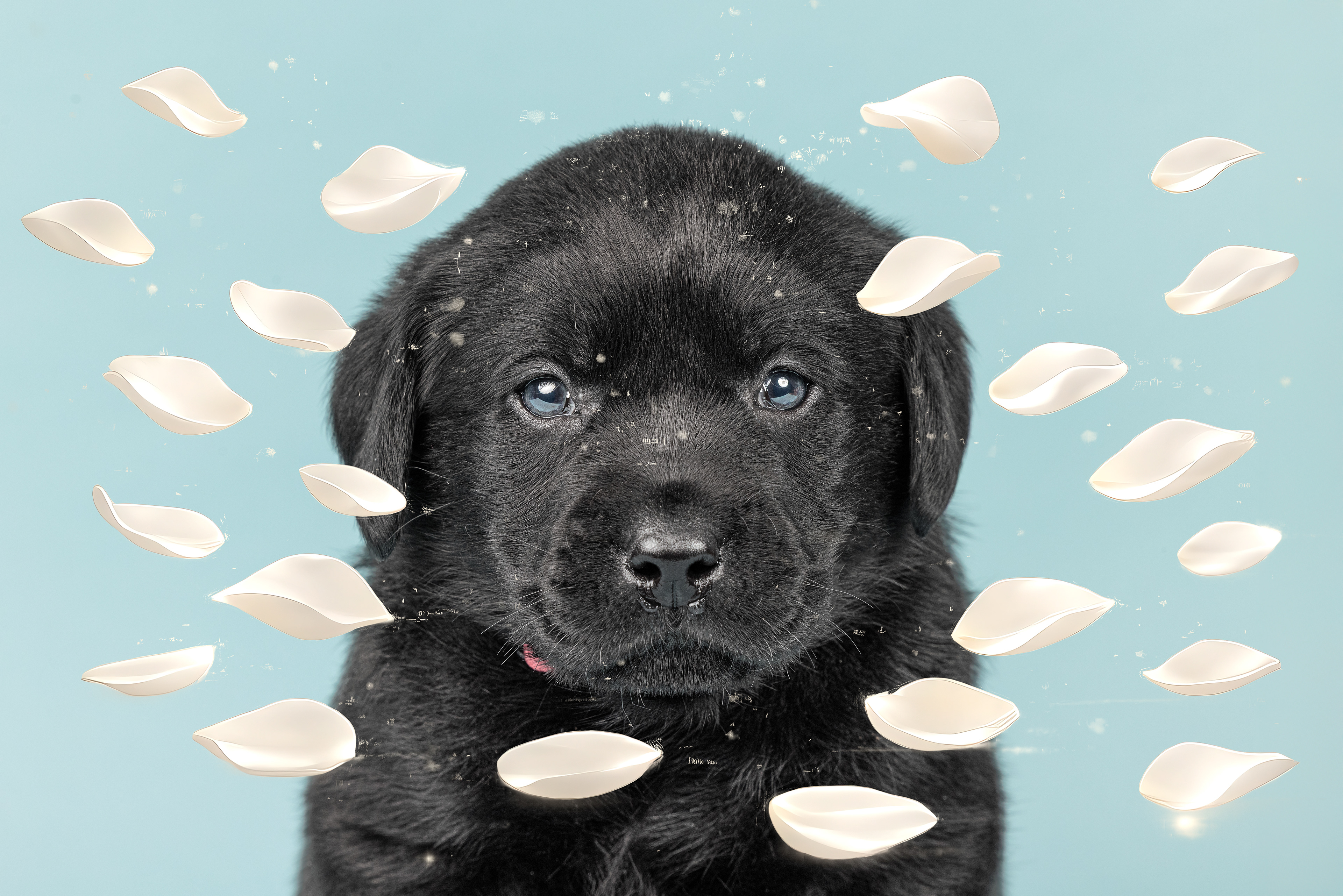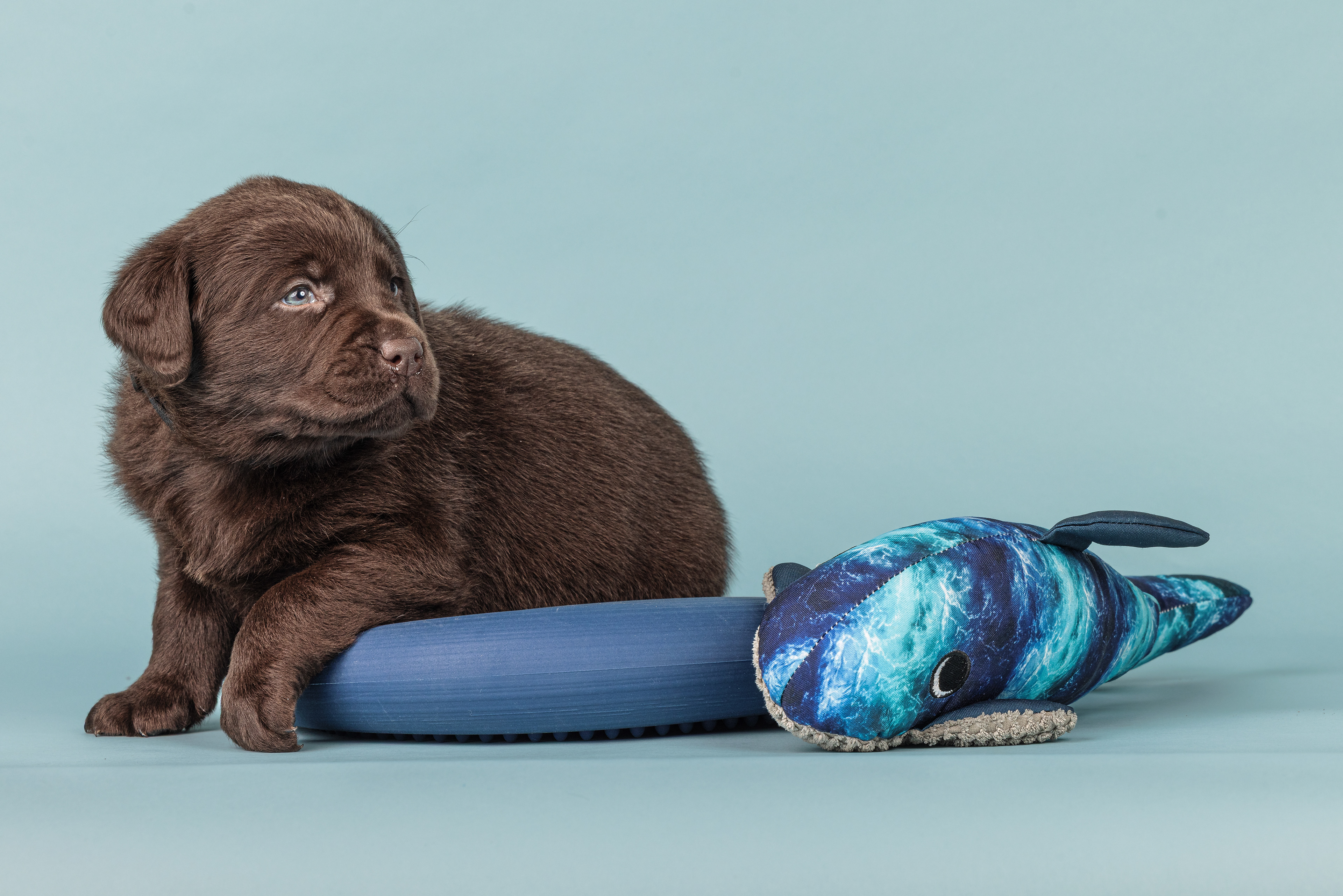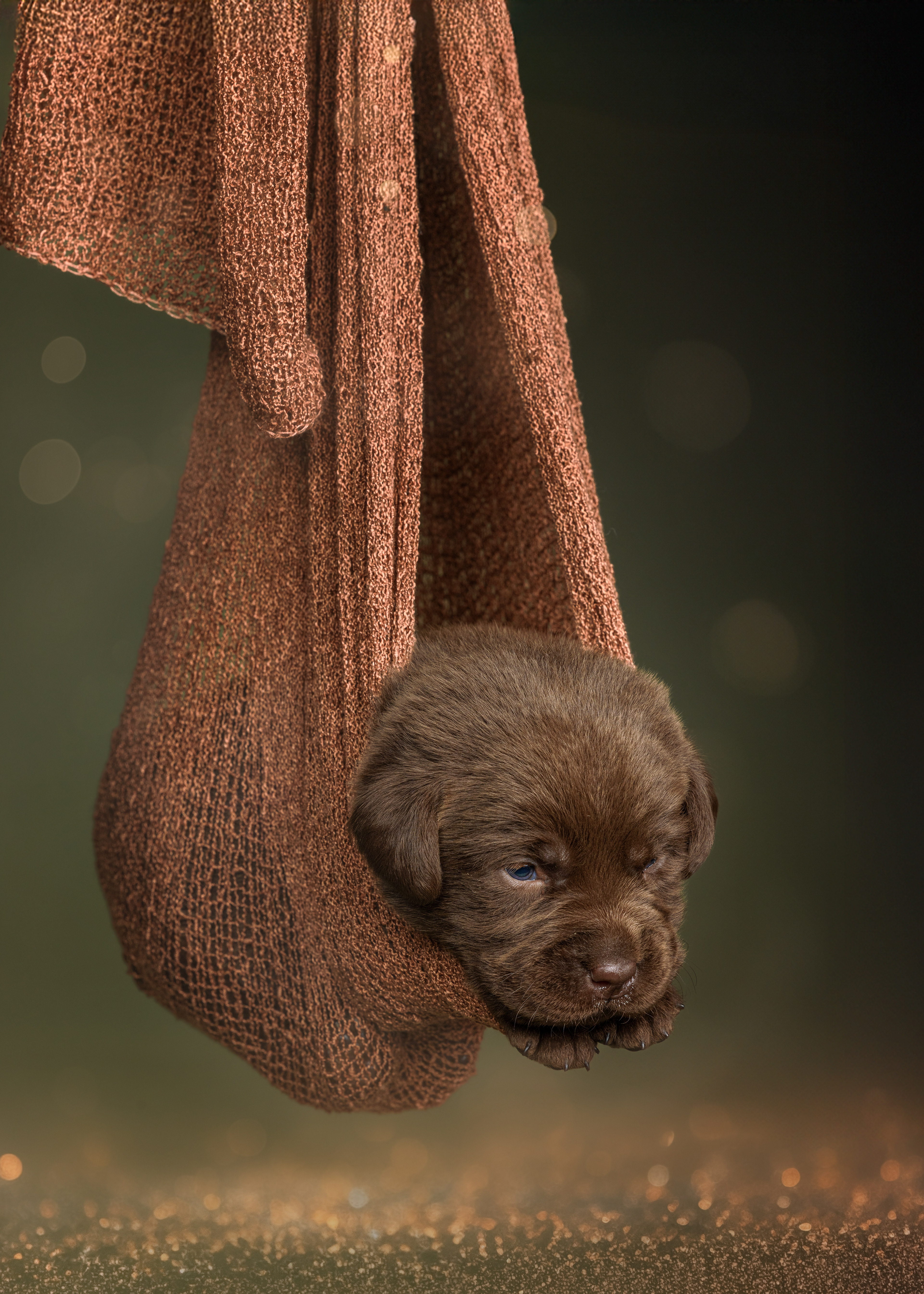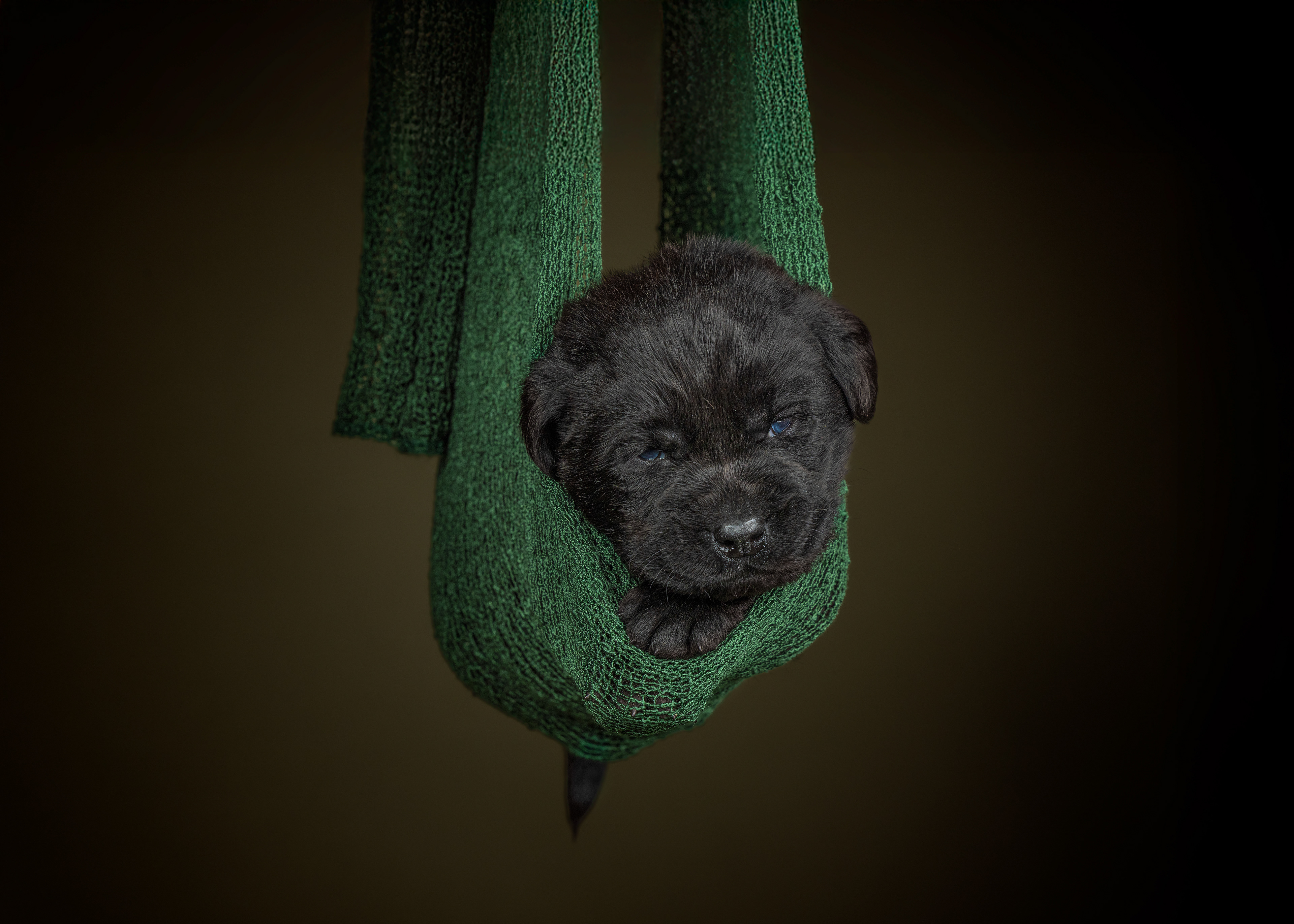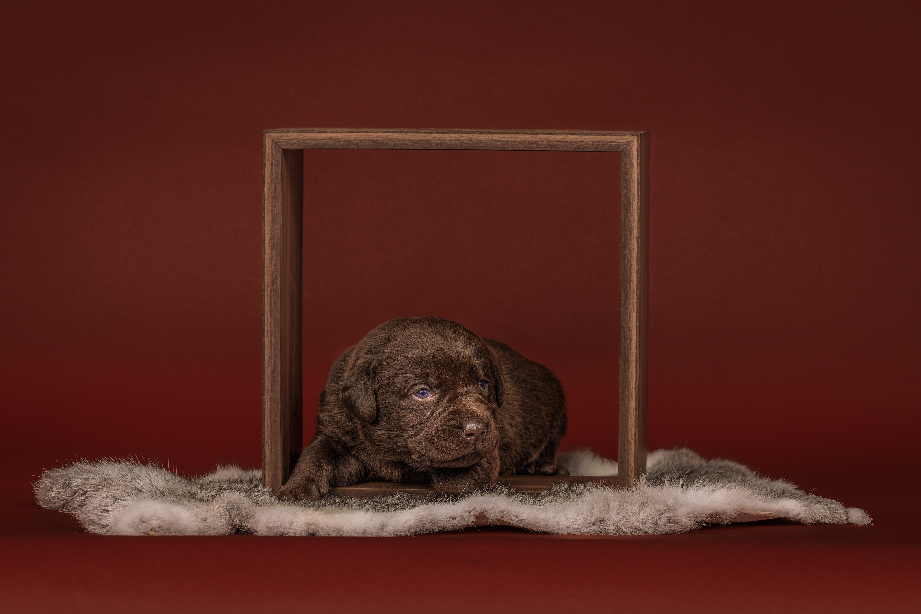 Vandaag de laatste dag van ons logeetje. Ik had bedacht om foto's van alle pups afzonderlijk te maken op een zwarte achtergrond en te werken met een perspex plaat voor reflectie. Omdat ik geen bellenblaas kon vinden, heb ik de bellen in Photoshop toegevoegd. Natuurlijk moest er ook een foto van haar hulphond gemaakt worden en dat was voor mij even een mooie gelegenheid om de instellingen goed te krijgen.