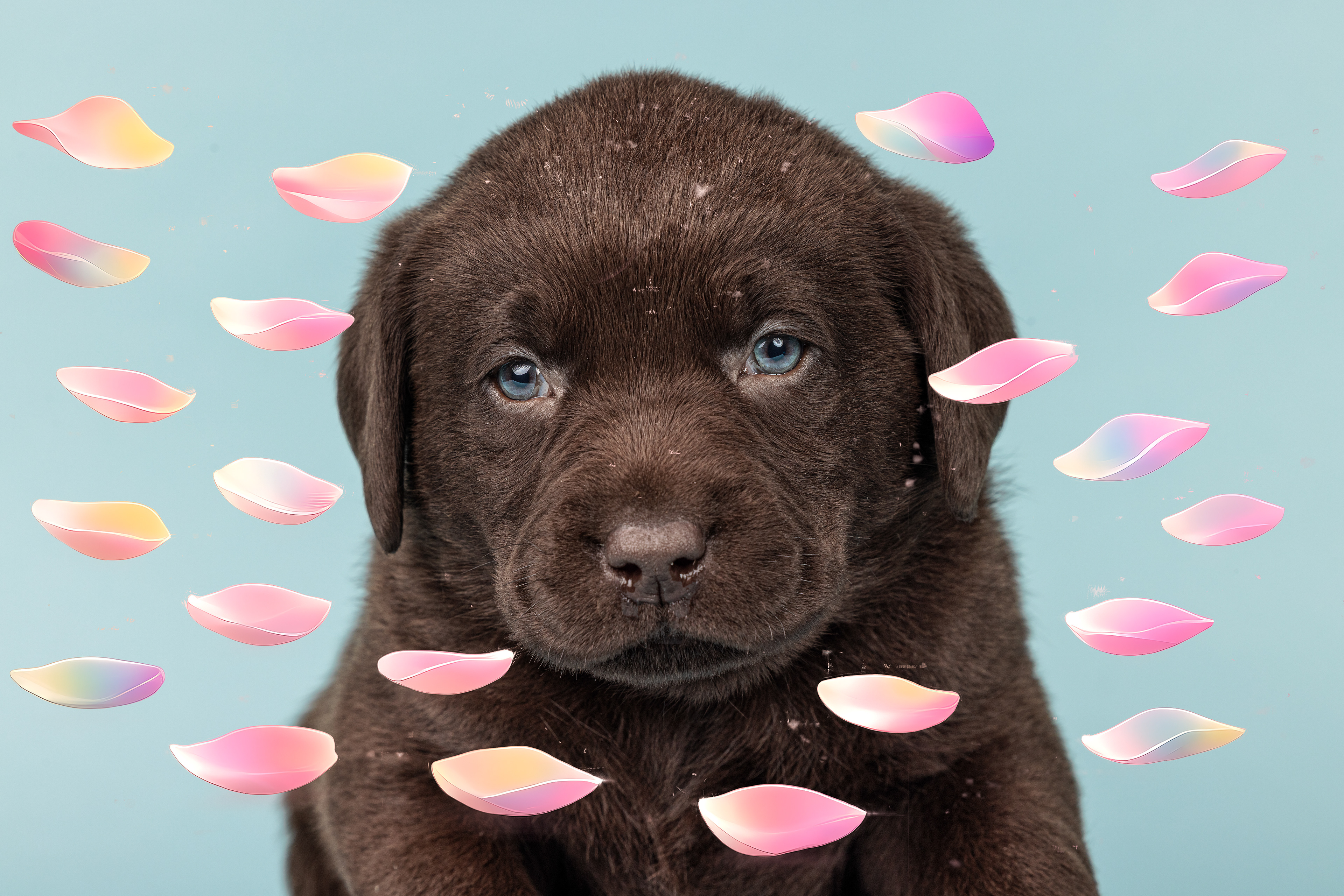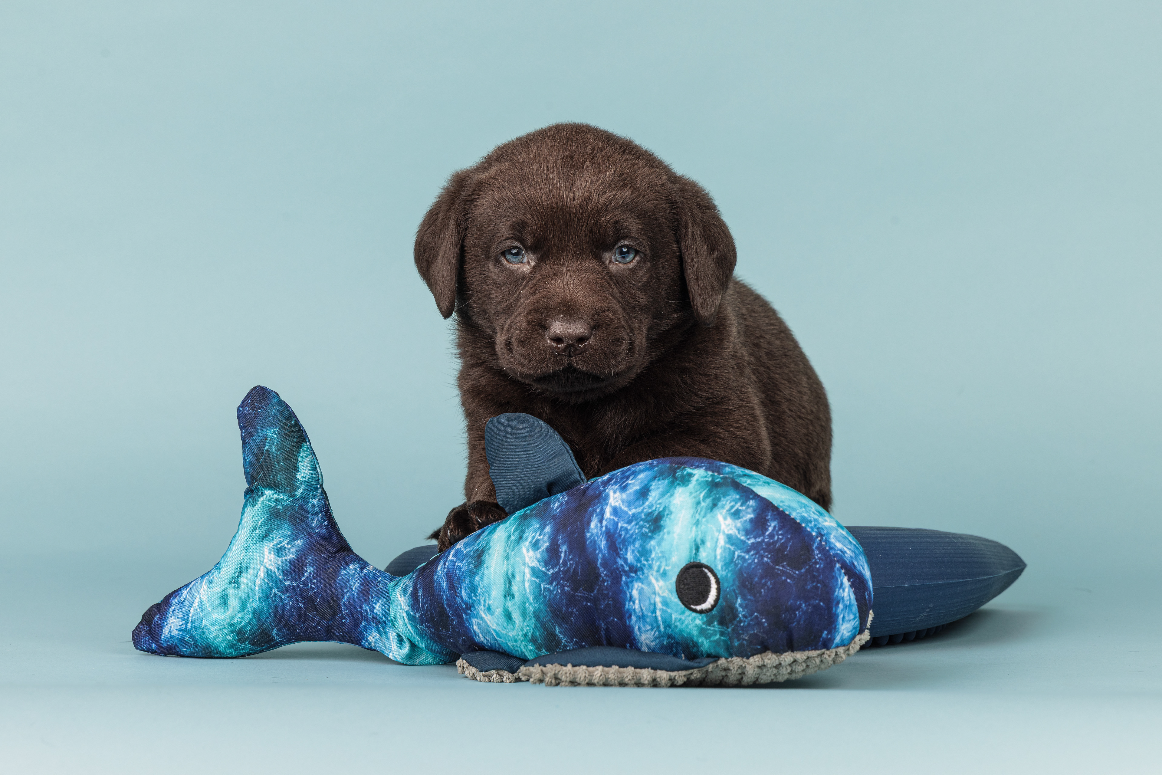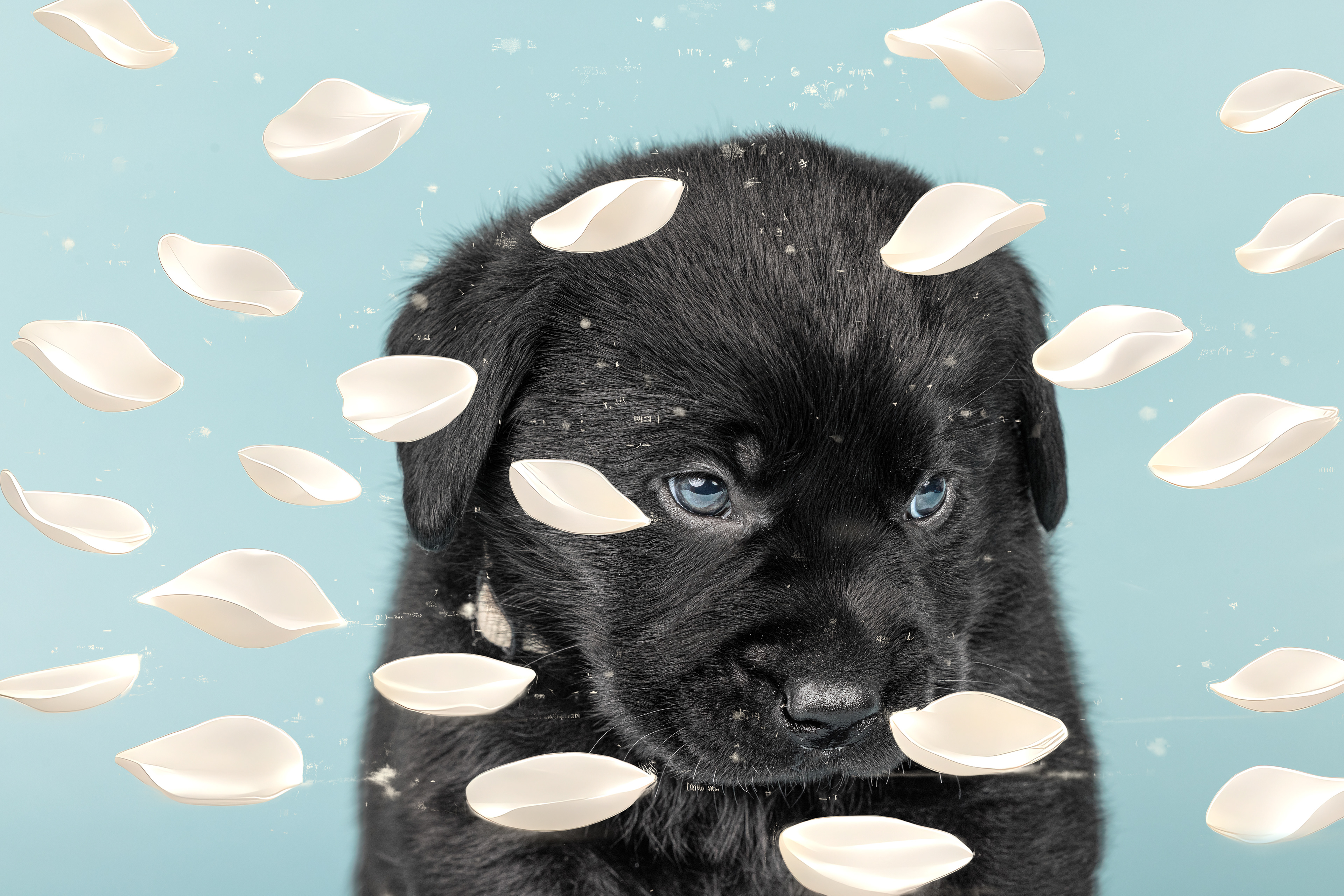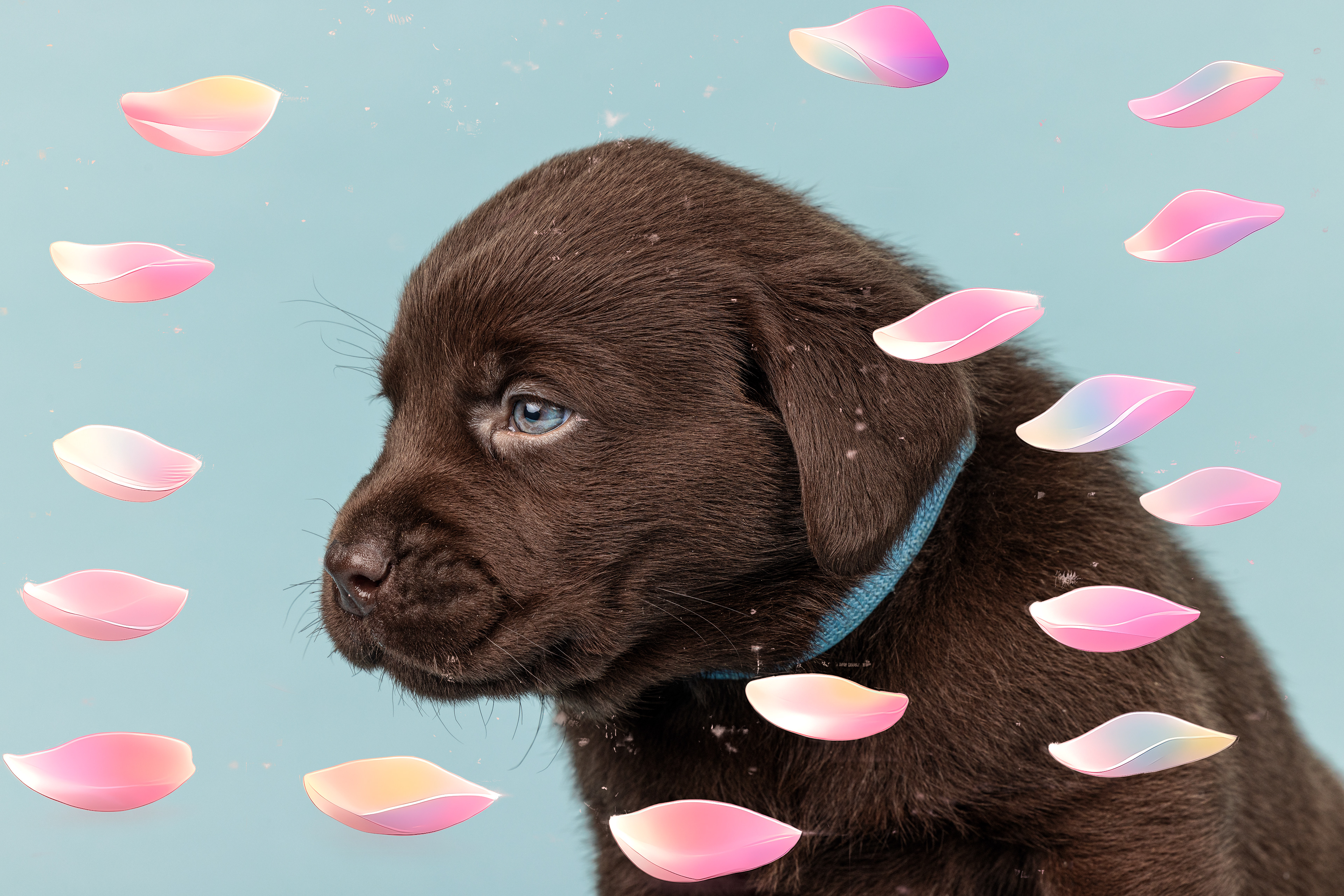 Vandaag de laatste dag van ons logeetje. Ik had bedacht om foto's van alle pups afzonderlijk te maken op een zwarte achtergrond en te werken met een perspex plaat voor reflectie. Omdat ik geen bellenblaas kon vinden, heb ik de bellen in Photoshop toegevoegd. Natuurlijk moest er ook een foto van haar hulphond gemaakt worden en dat was voor mij even een mooie gelegenheid om de instellingen goed te krijgen.