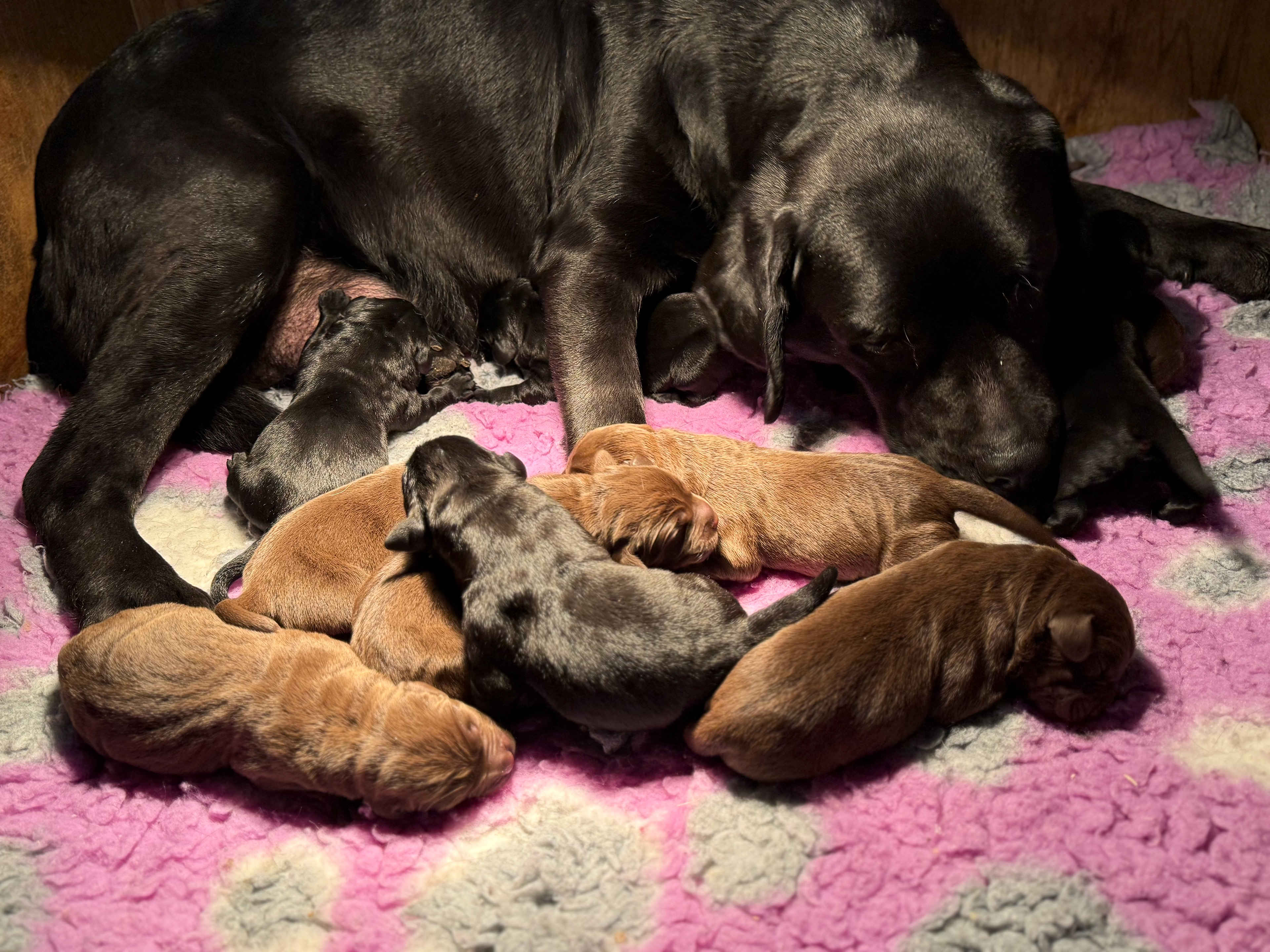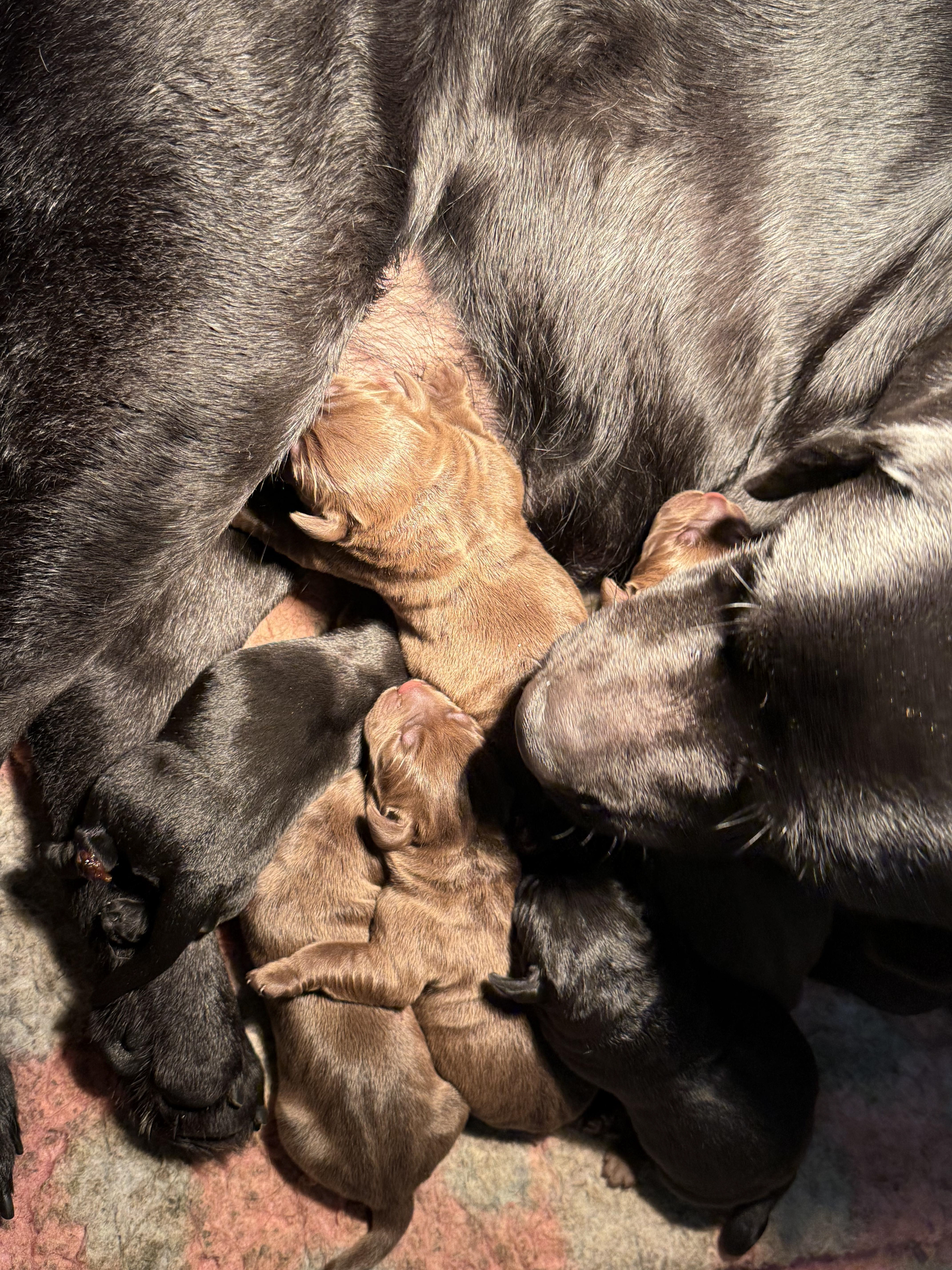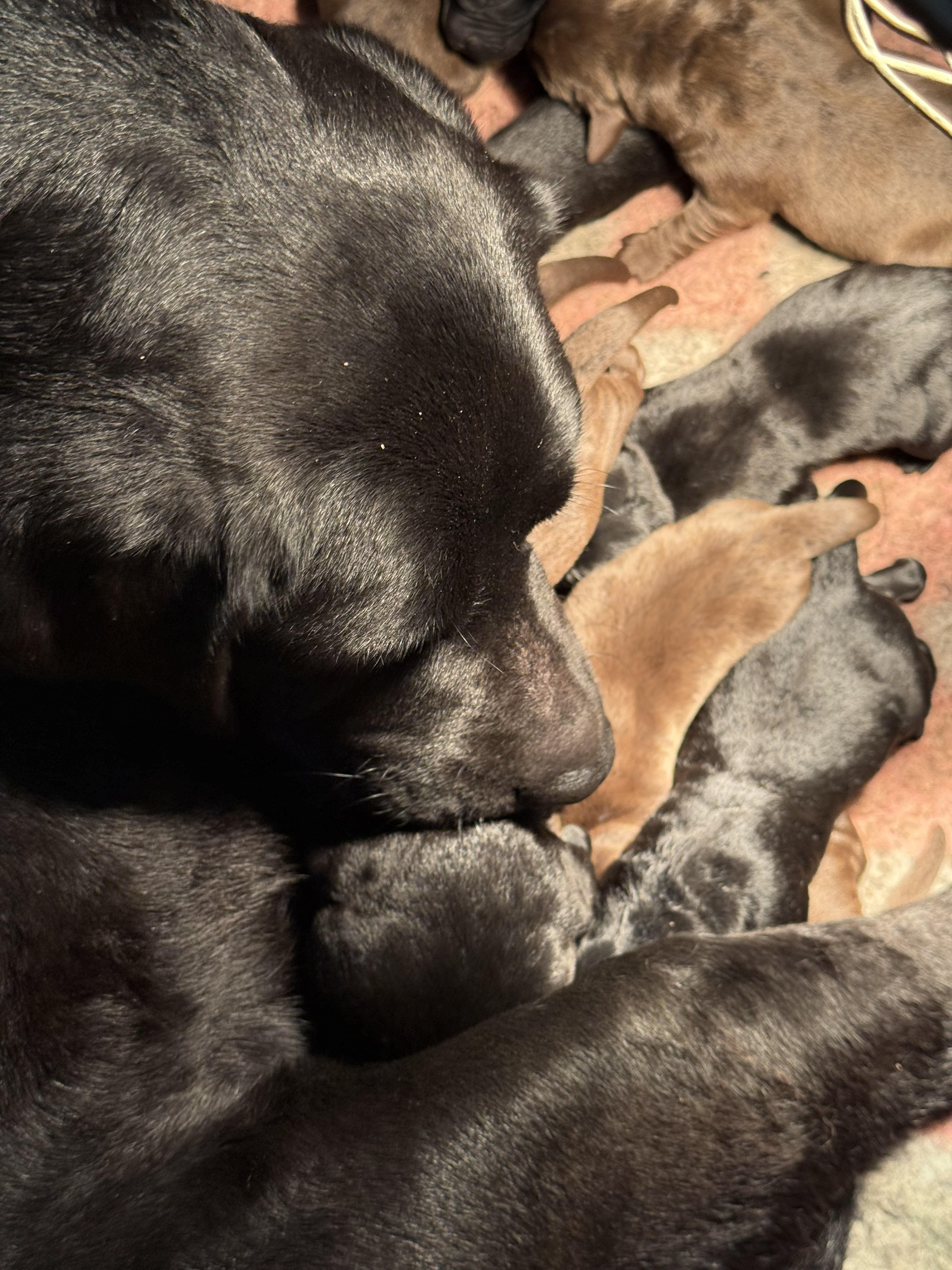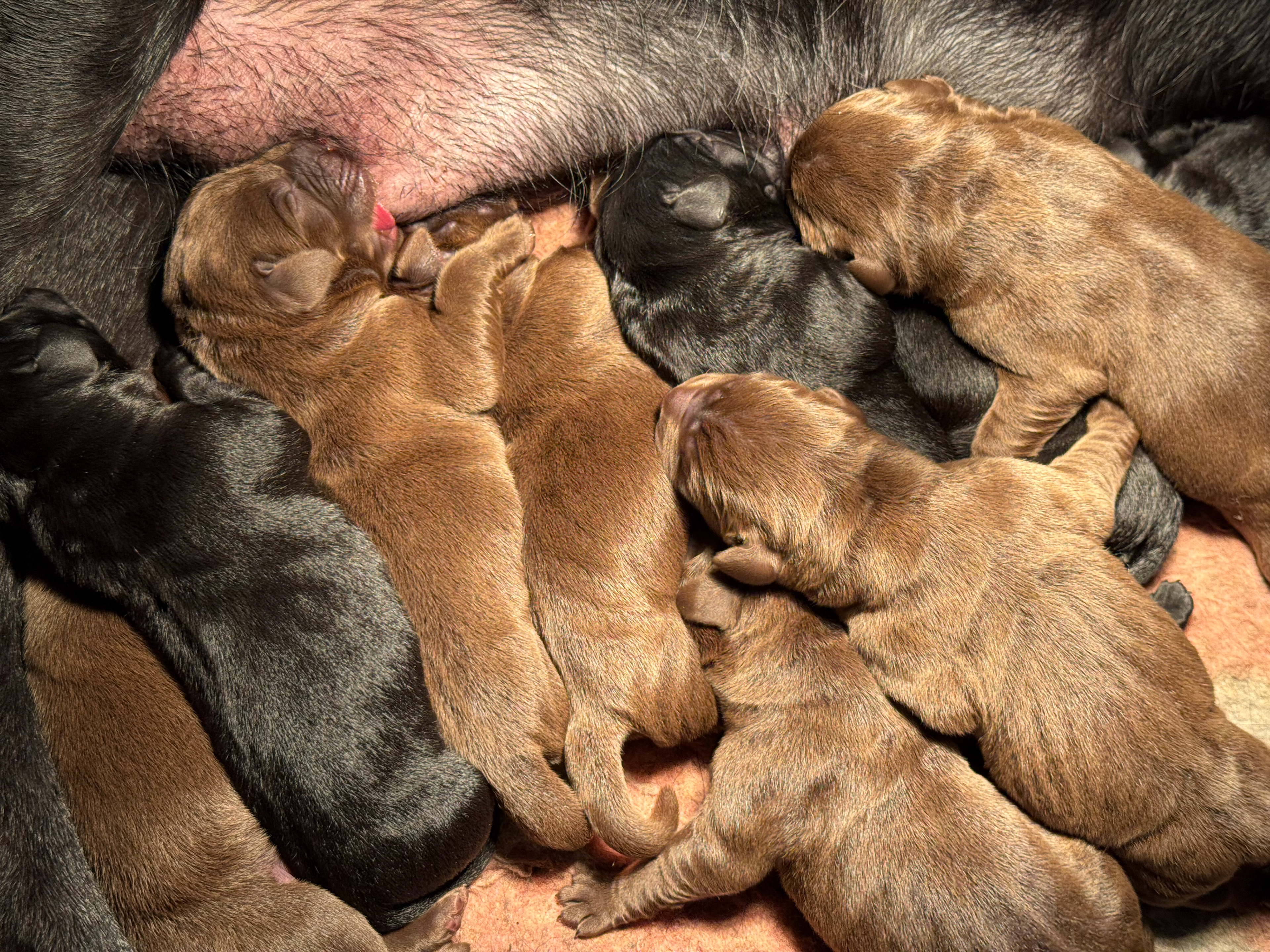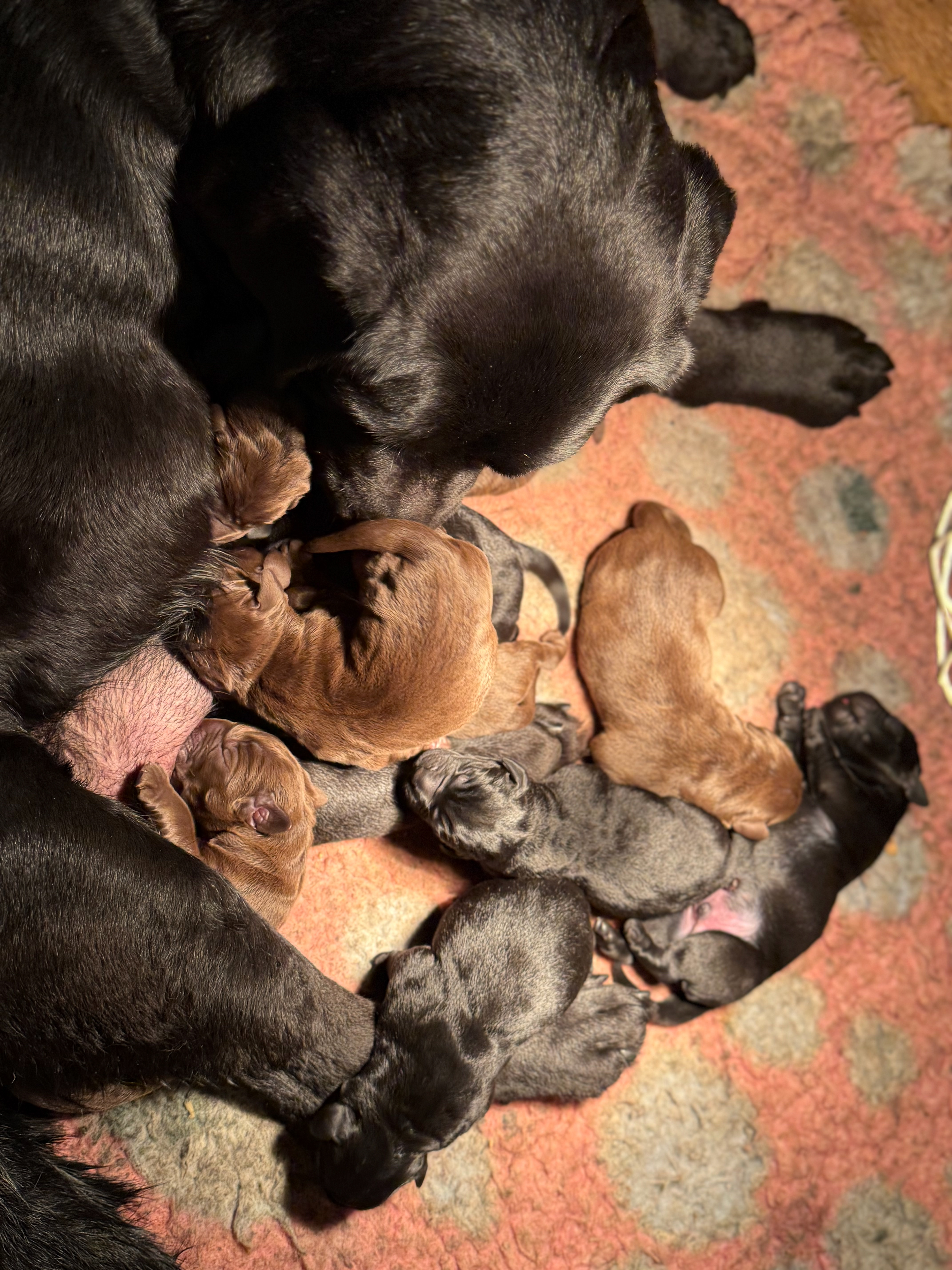 Ze is om 8 uur in de ochtend begonnen en was om half 6 klaar, ze begon met een bruine teef en eindigde met een bruine teef .. Dat zegt natuurlijk niets over wat er tussenin geboren was .. Dat waren 5 bruine reuen, 3 zwarte reuen en een zwart teefje!