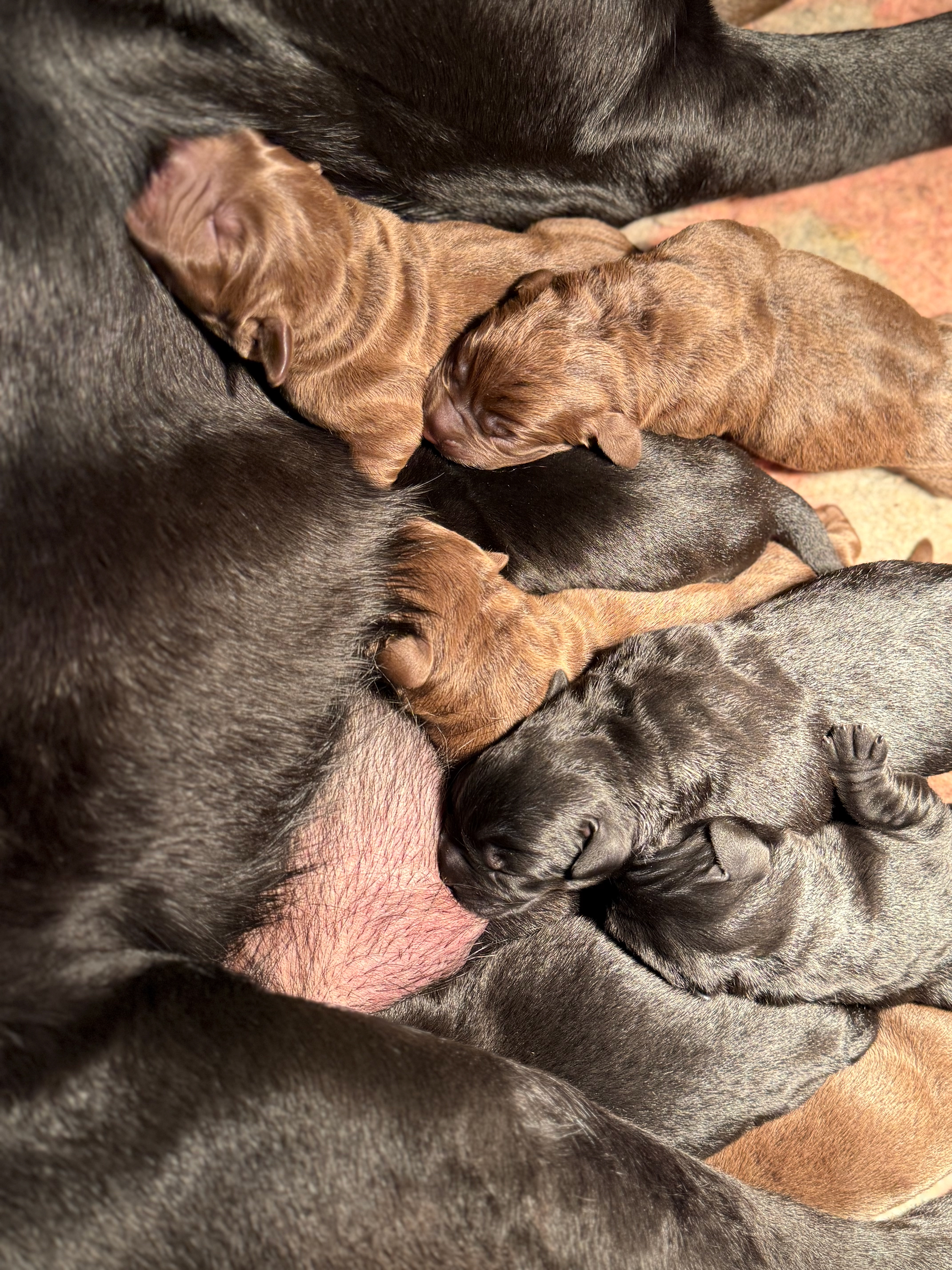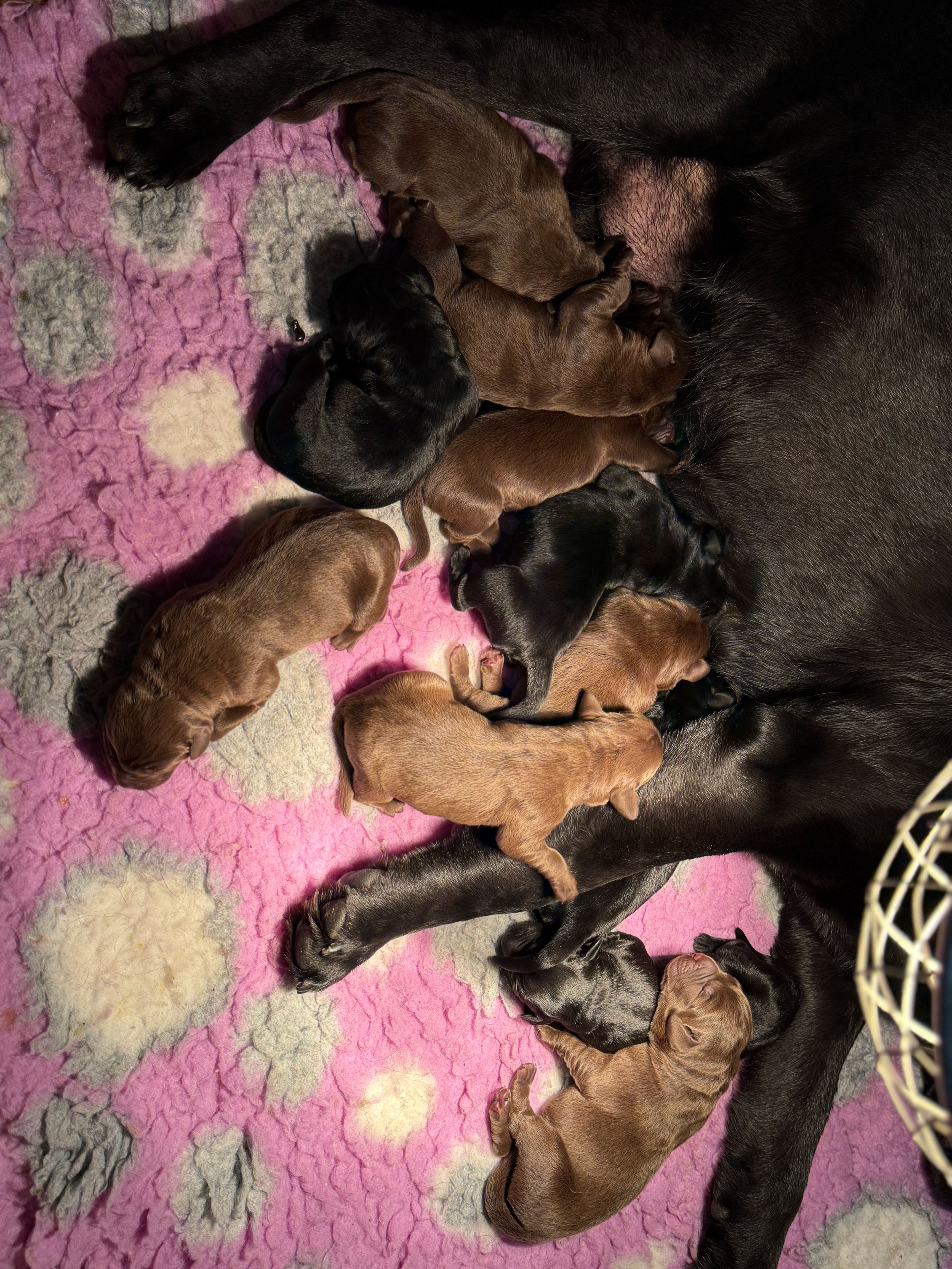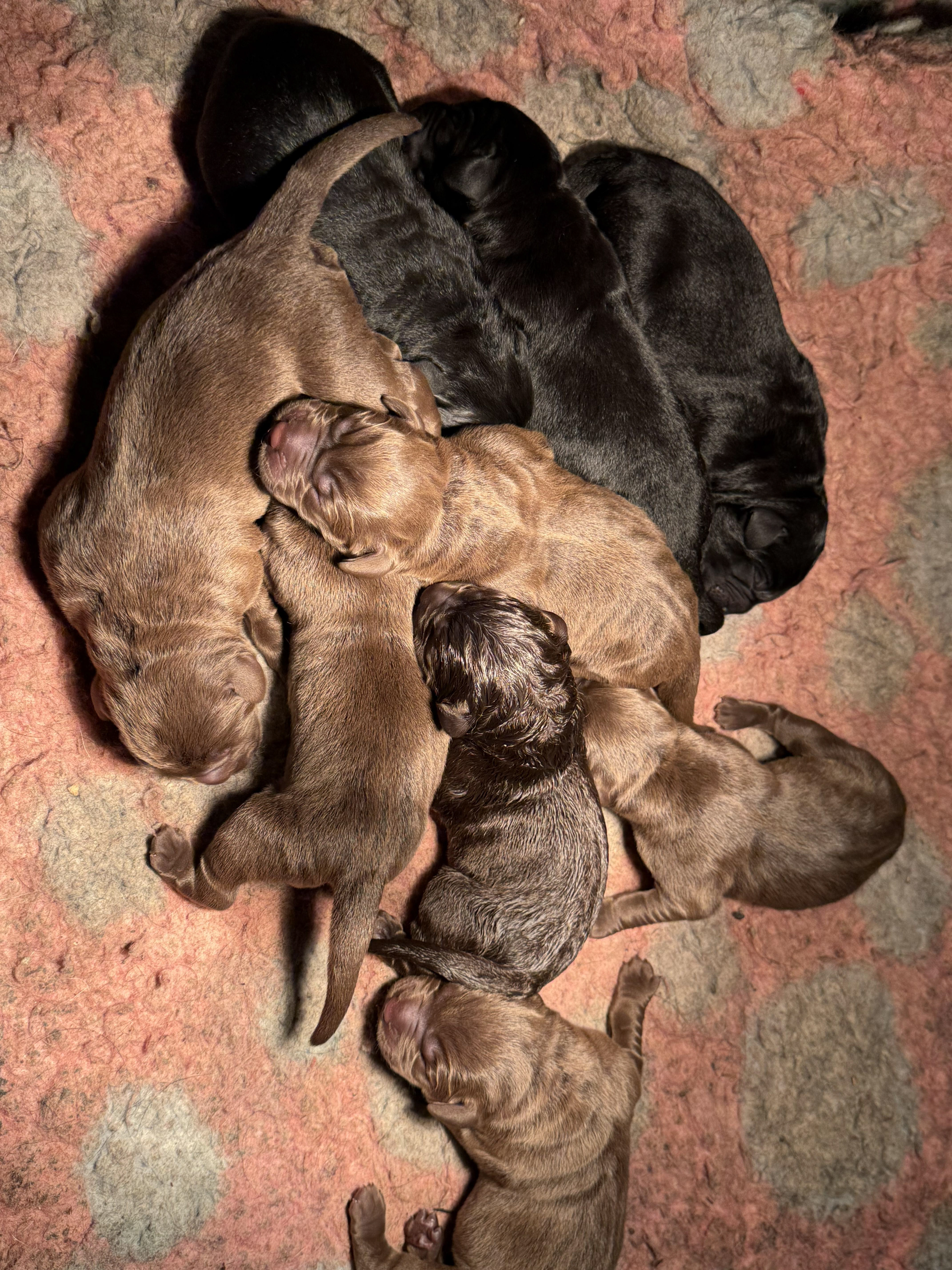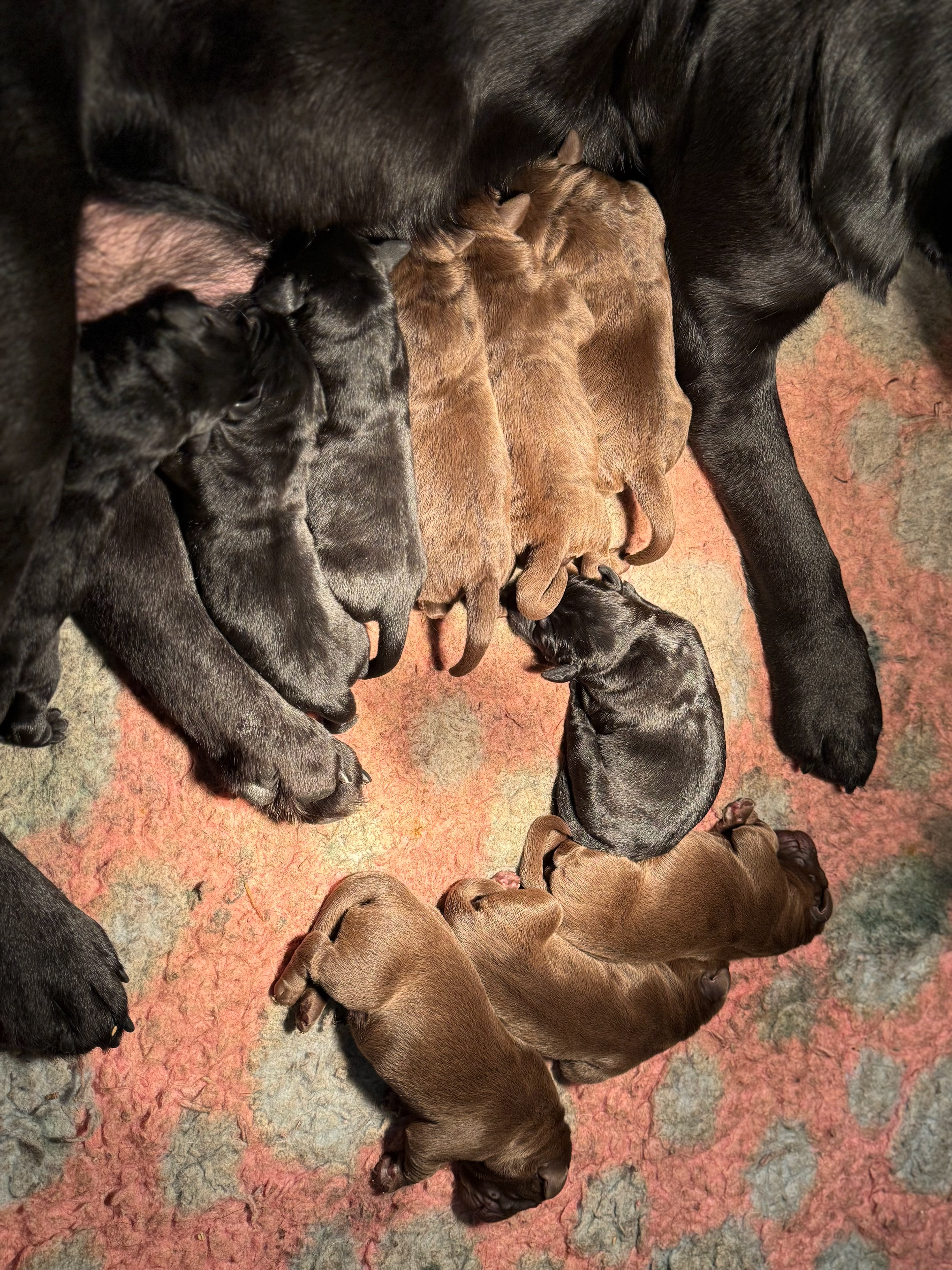 Ze is om 8 uur in de ochtend begonnen en was om half 6 klaar, ze begon met een bruine teef en eindigde met een bruine teef .. Dat zegt natuurlijk niets over wat er tussenin geboren was .. Dat waren 5 bruine reuen, 3 zwarte reuen en een zwart teefje!