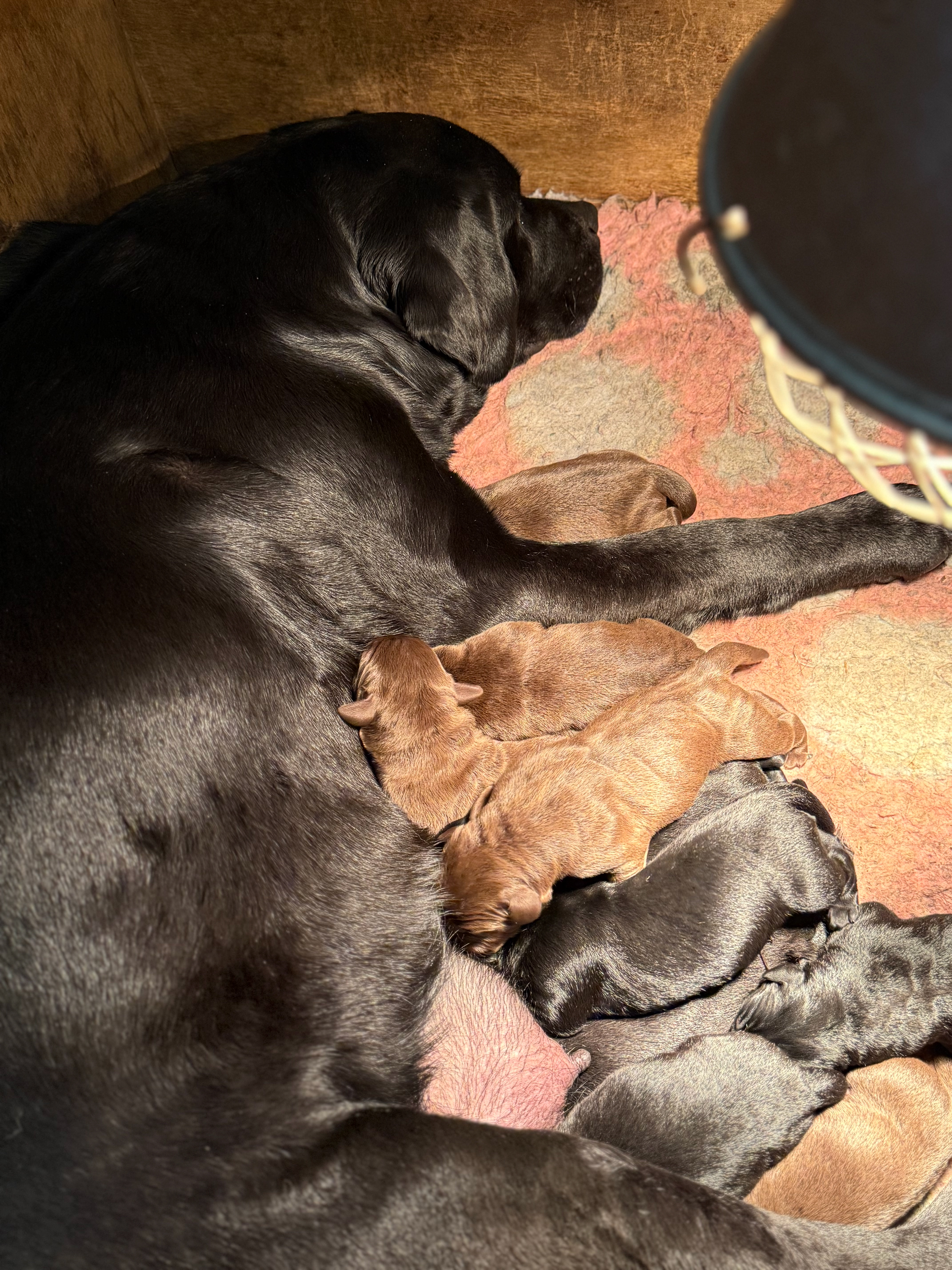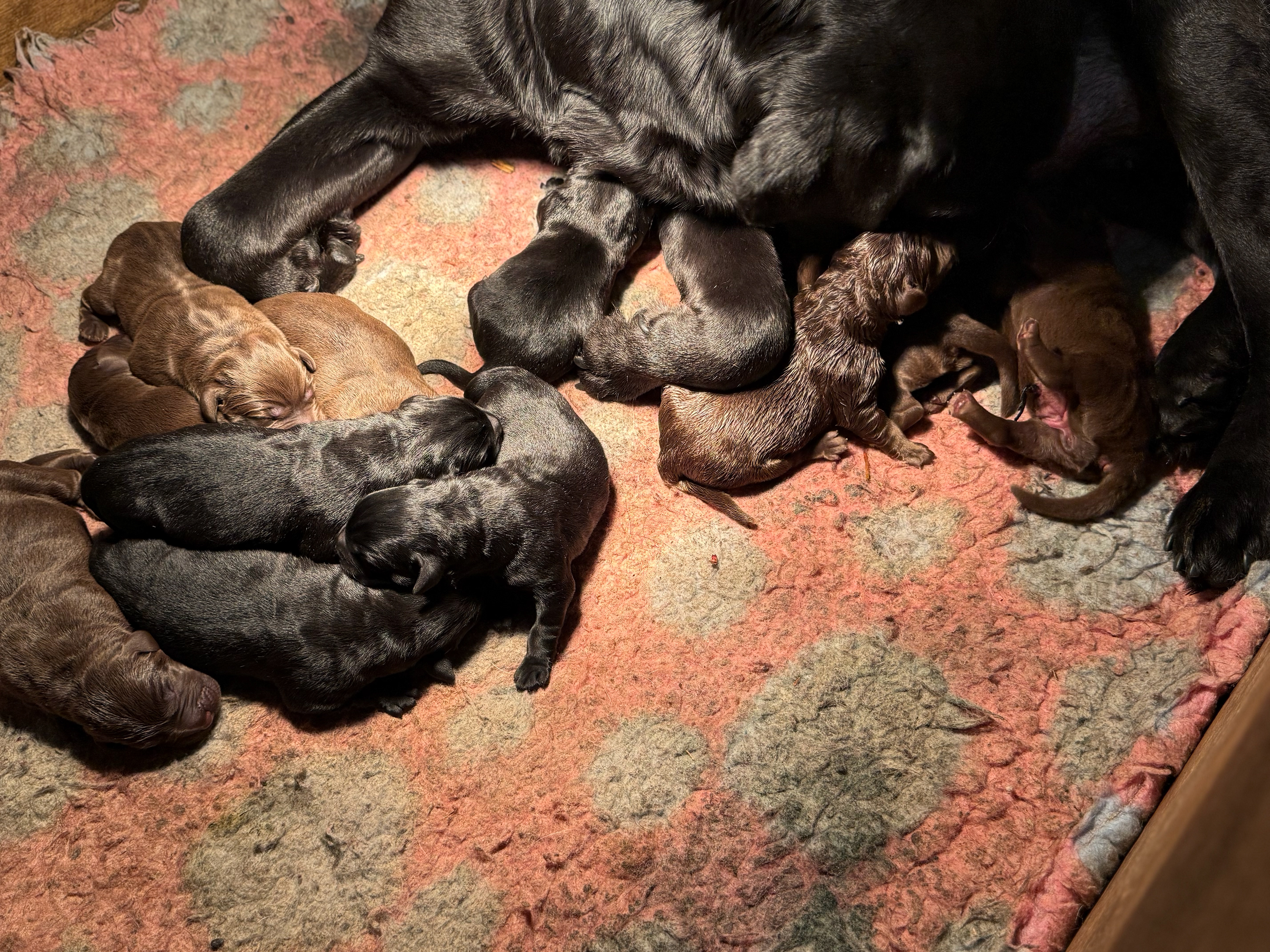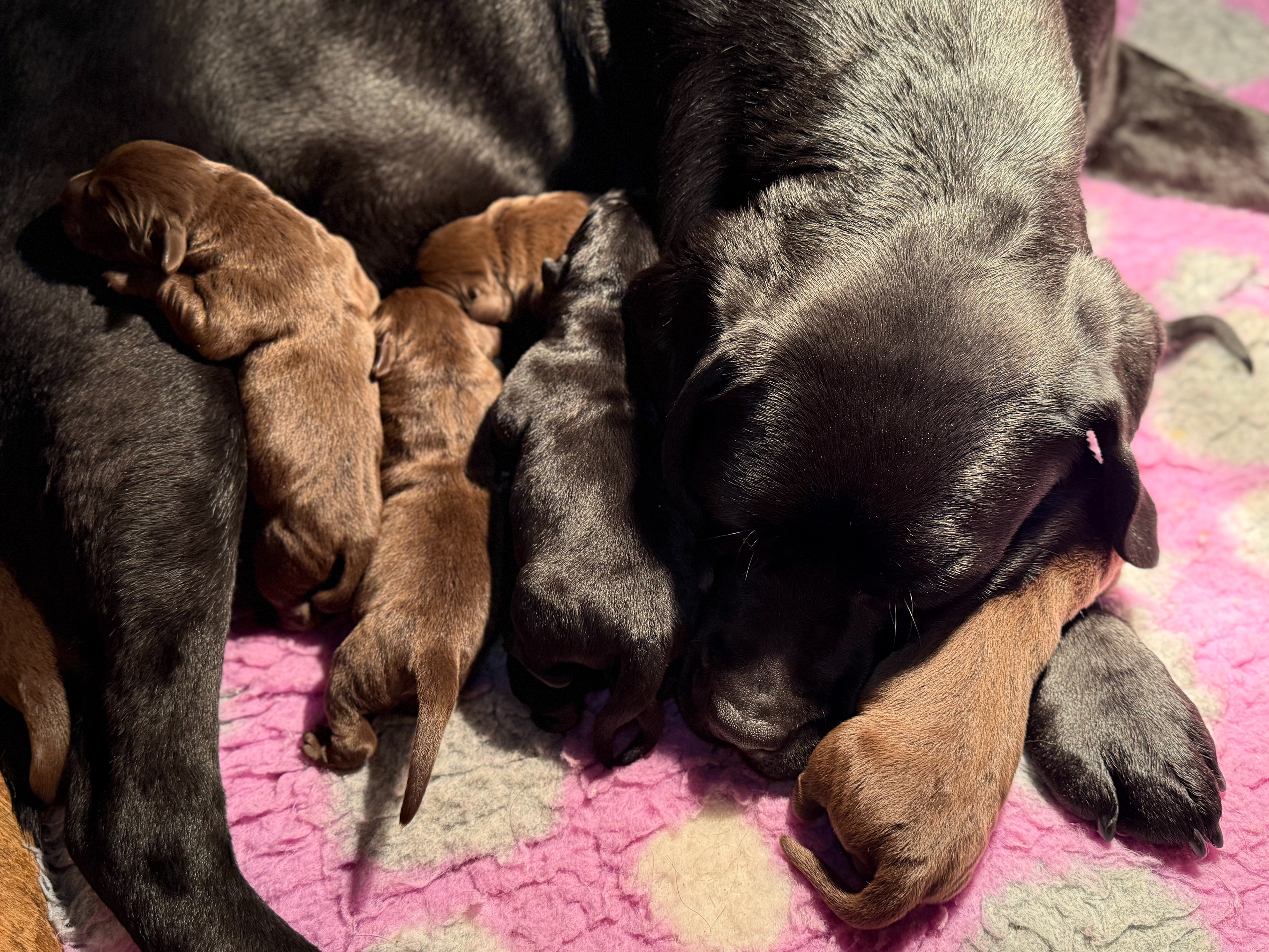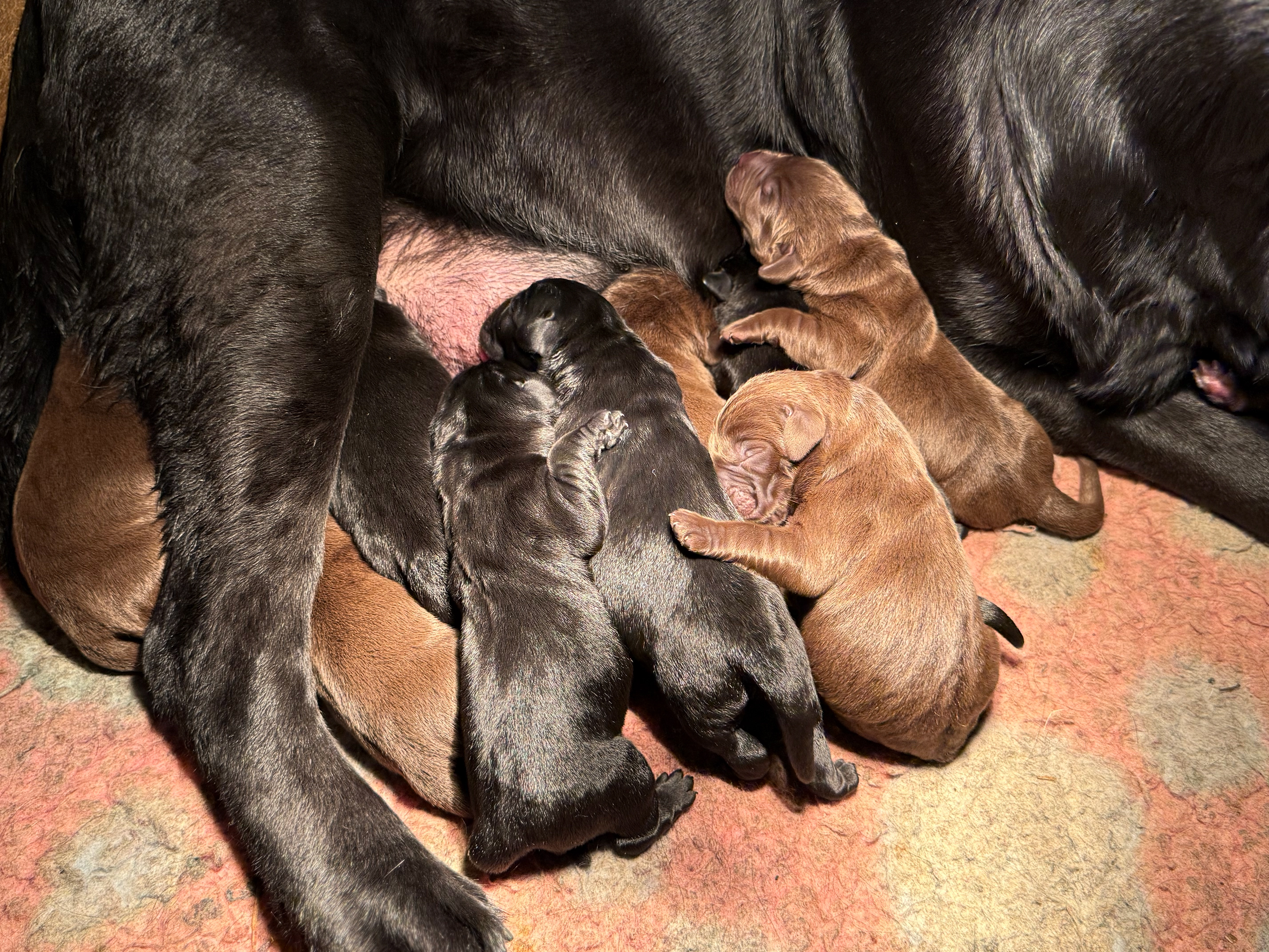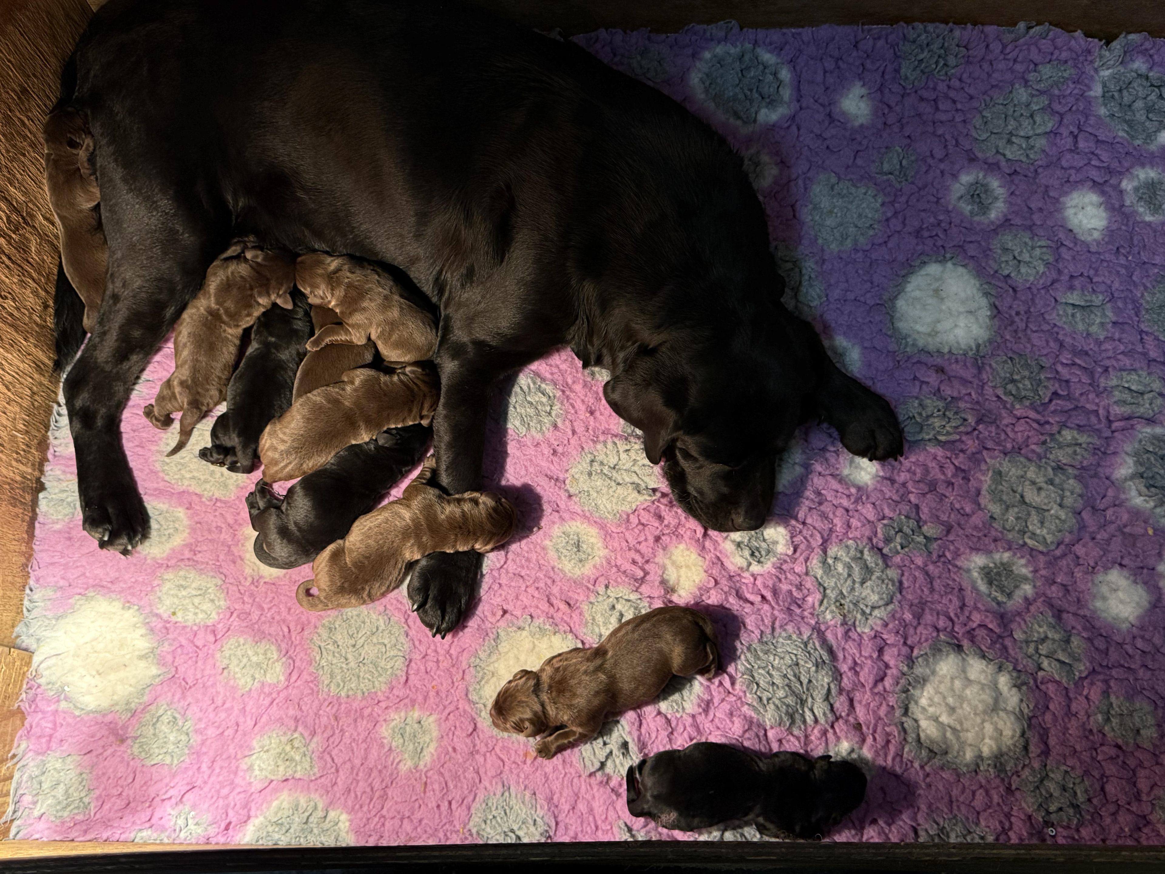 Ze is om 8 uur in de ochtend begonnen en was om half 6 klaar, ze begon met een bruine teef en eindigde met een bruine teef .. Dat zegt natuurlijk niets over wat er tussenin geboren was .. Dat waren 5 bruine reuen, 3 zwarte reuen en een zwart teefje!