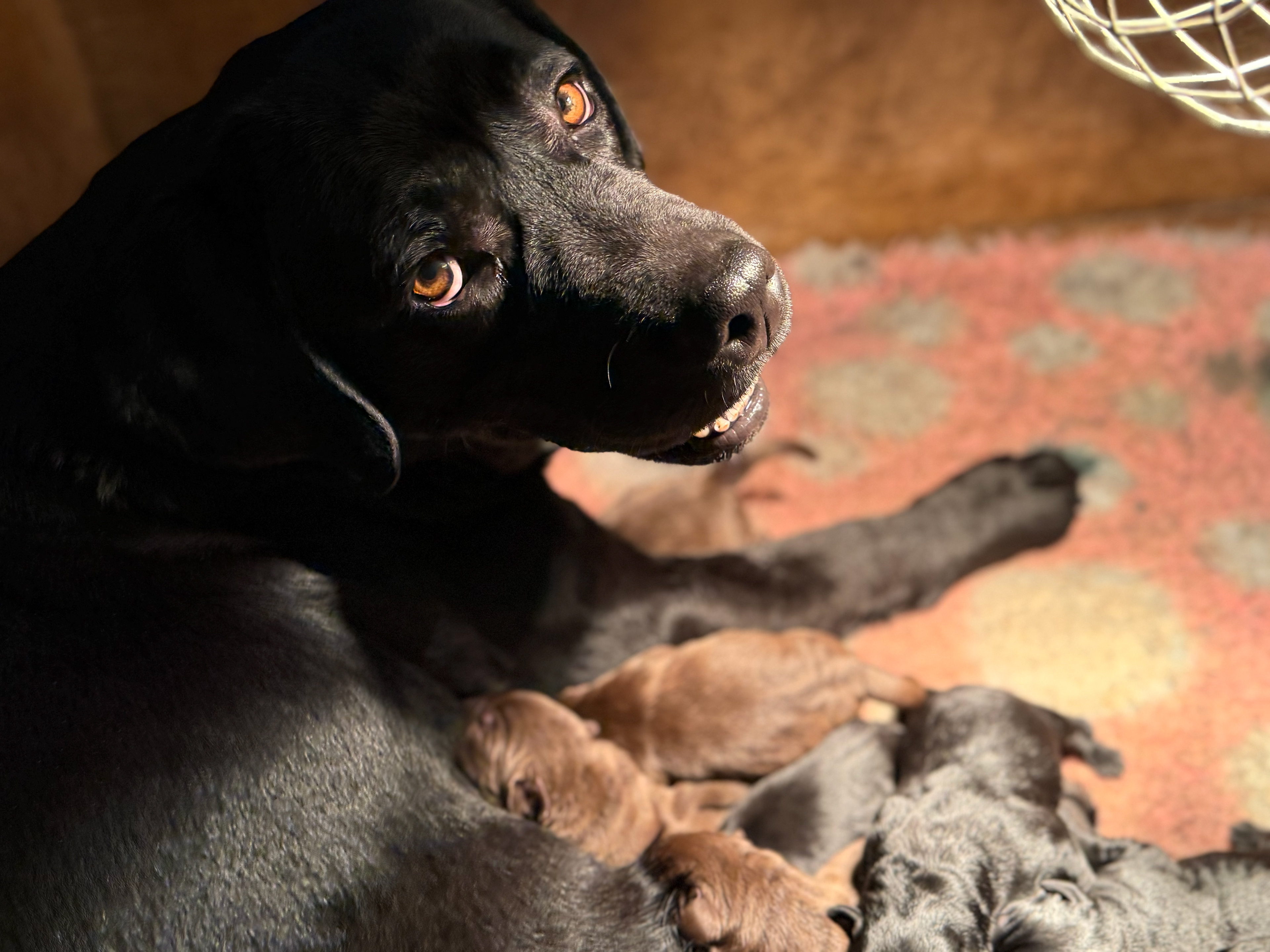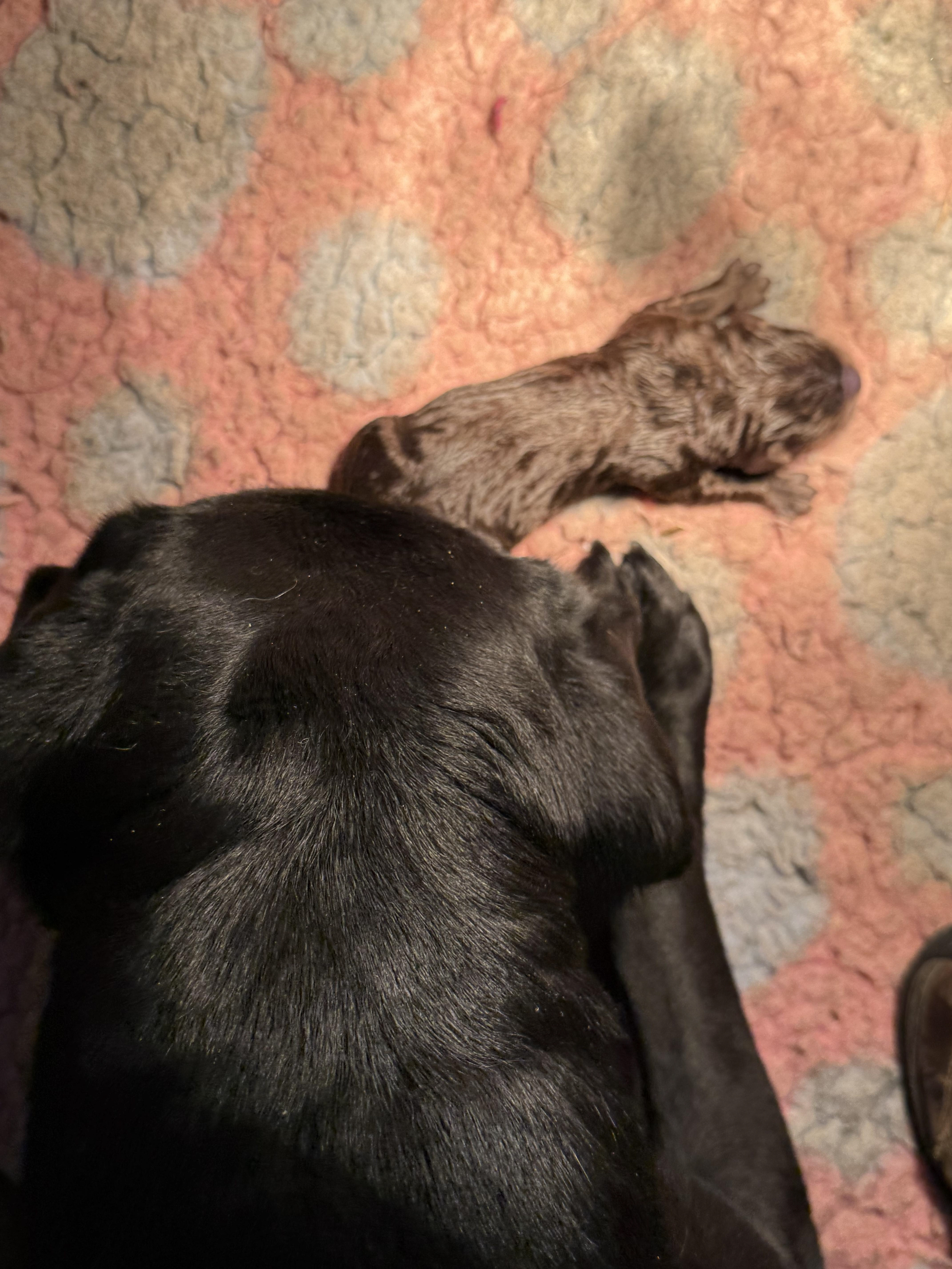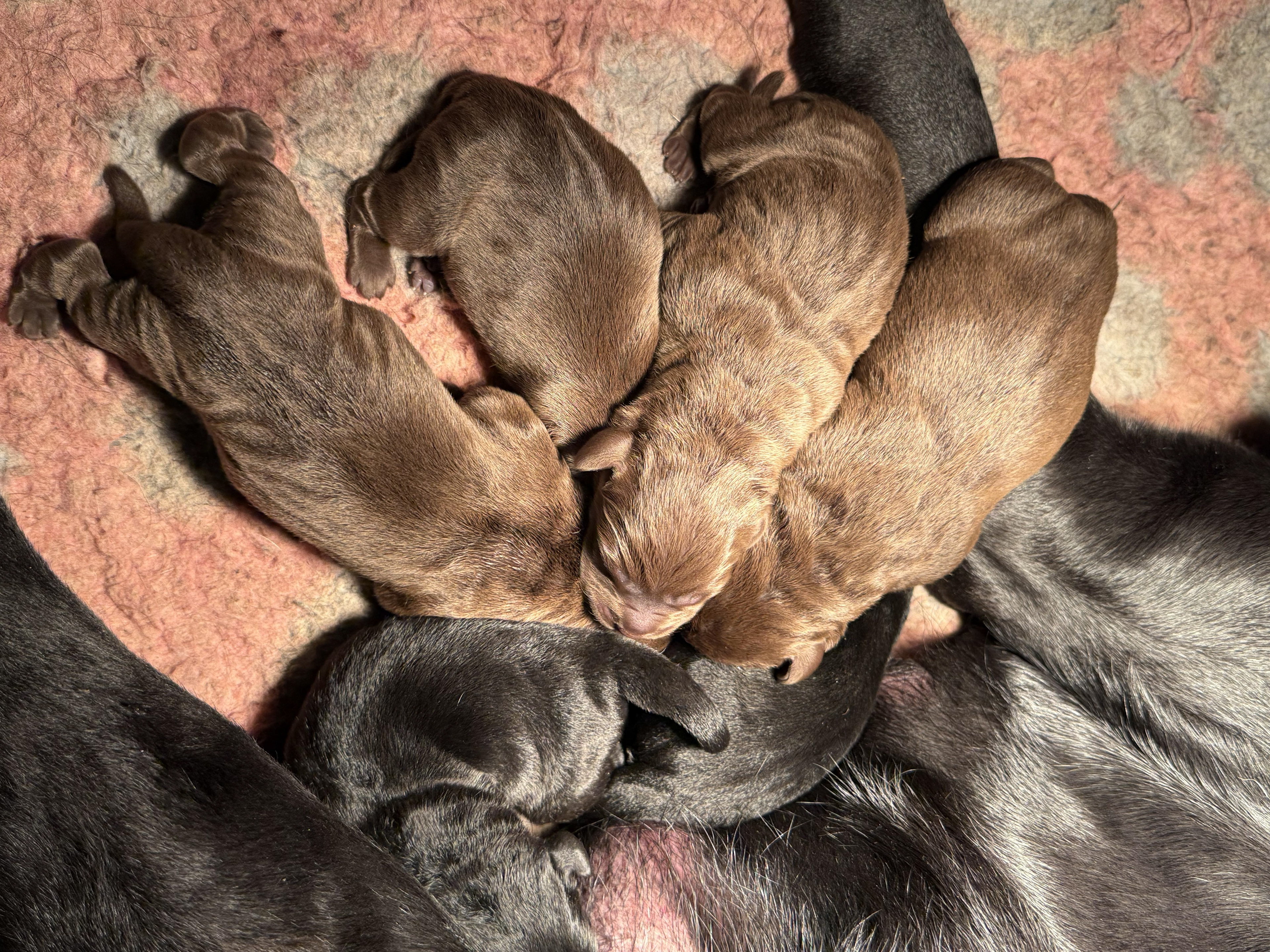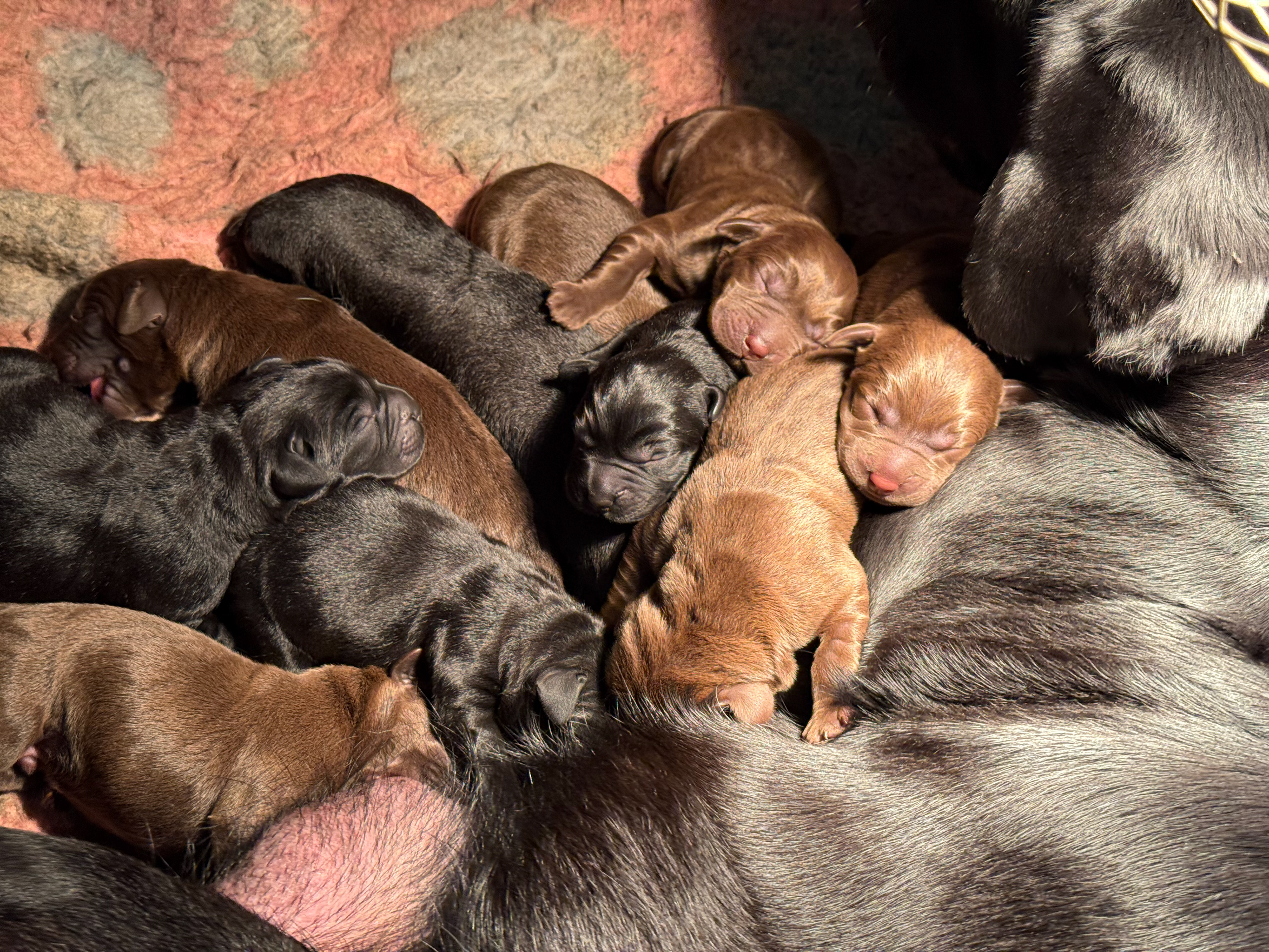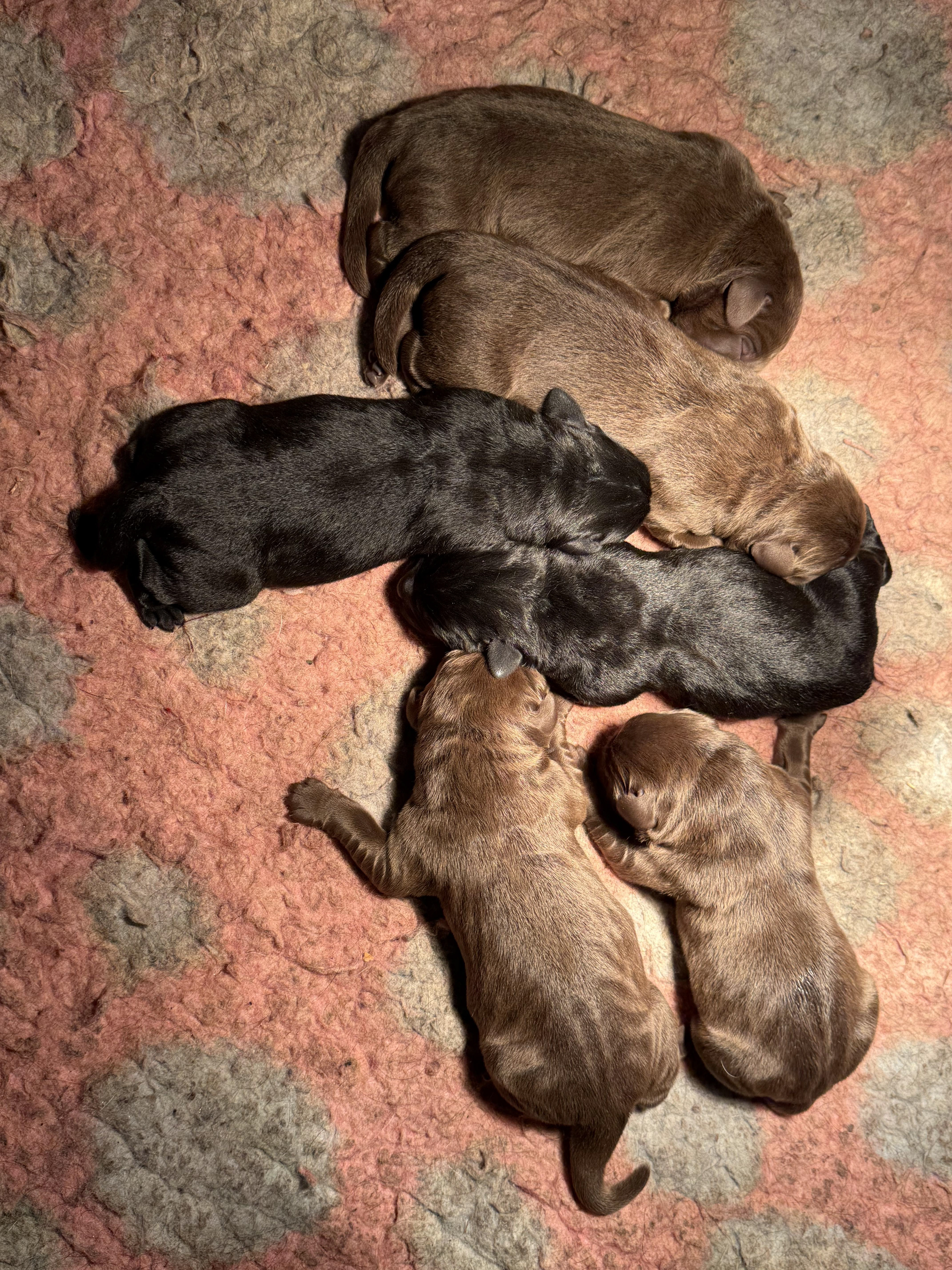 Ze is om 8 uur in de ochtend begonnen en was om half 6 klaar, ze begon met een bruine teef en eindigde met een bruine teef .. Dat zegt natuurlijk niets over wat er tussenin geboren was .. Dat waren 5 bruine reuen, 3 zwarte reuen en een zwart teefje!